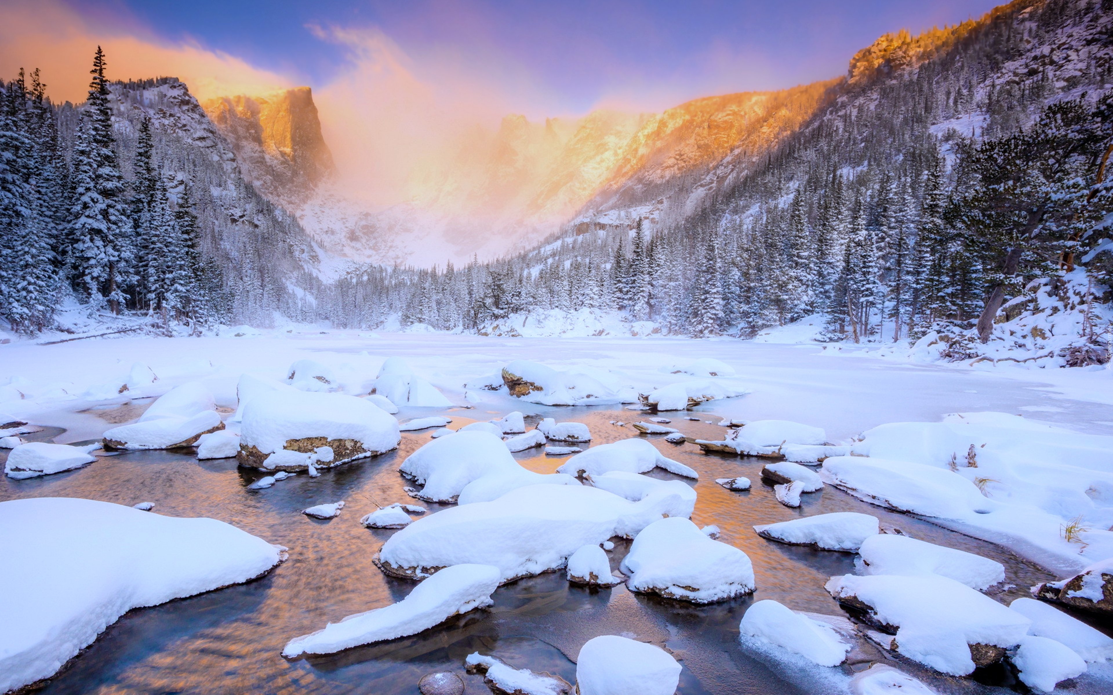 Edytor tapety: Zachód Słońca, Góry, Drzewa, Rzeka, Zima