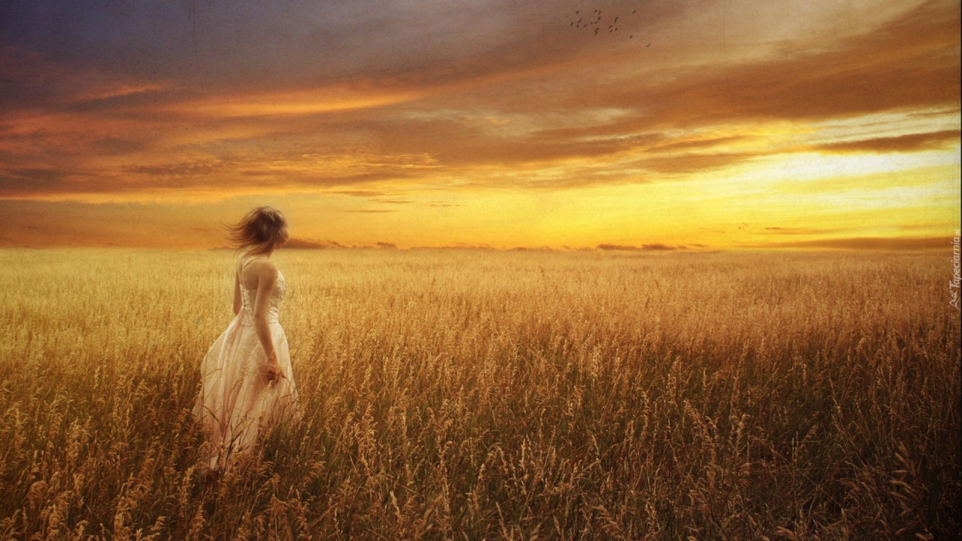 Edytor tapety: Zachód Słońca, Łany, Zboża, Kobieta