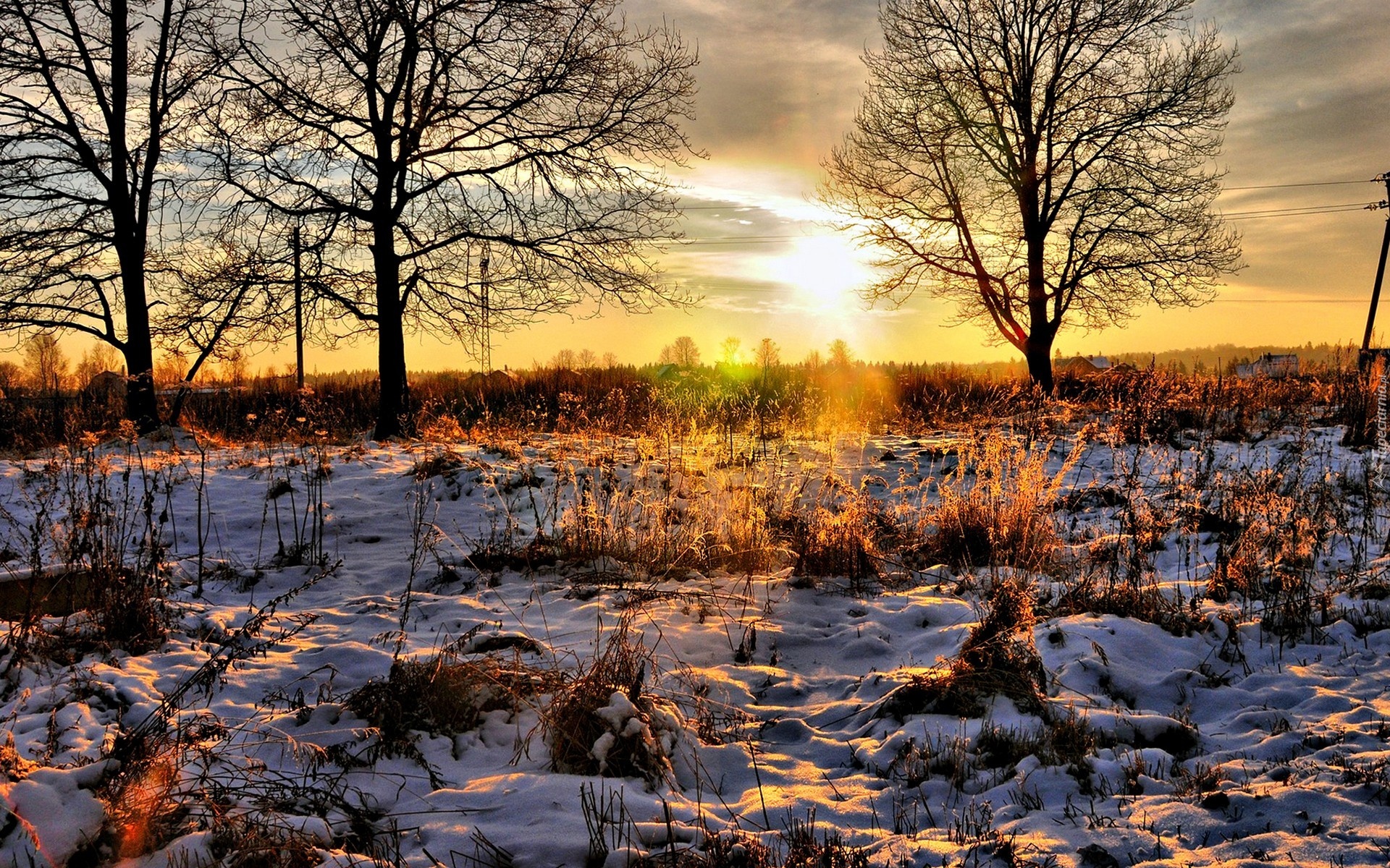 Edytor tapety: Zima, Drzewa, Zachód Słońca