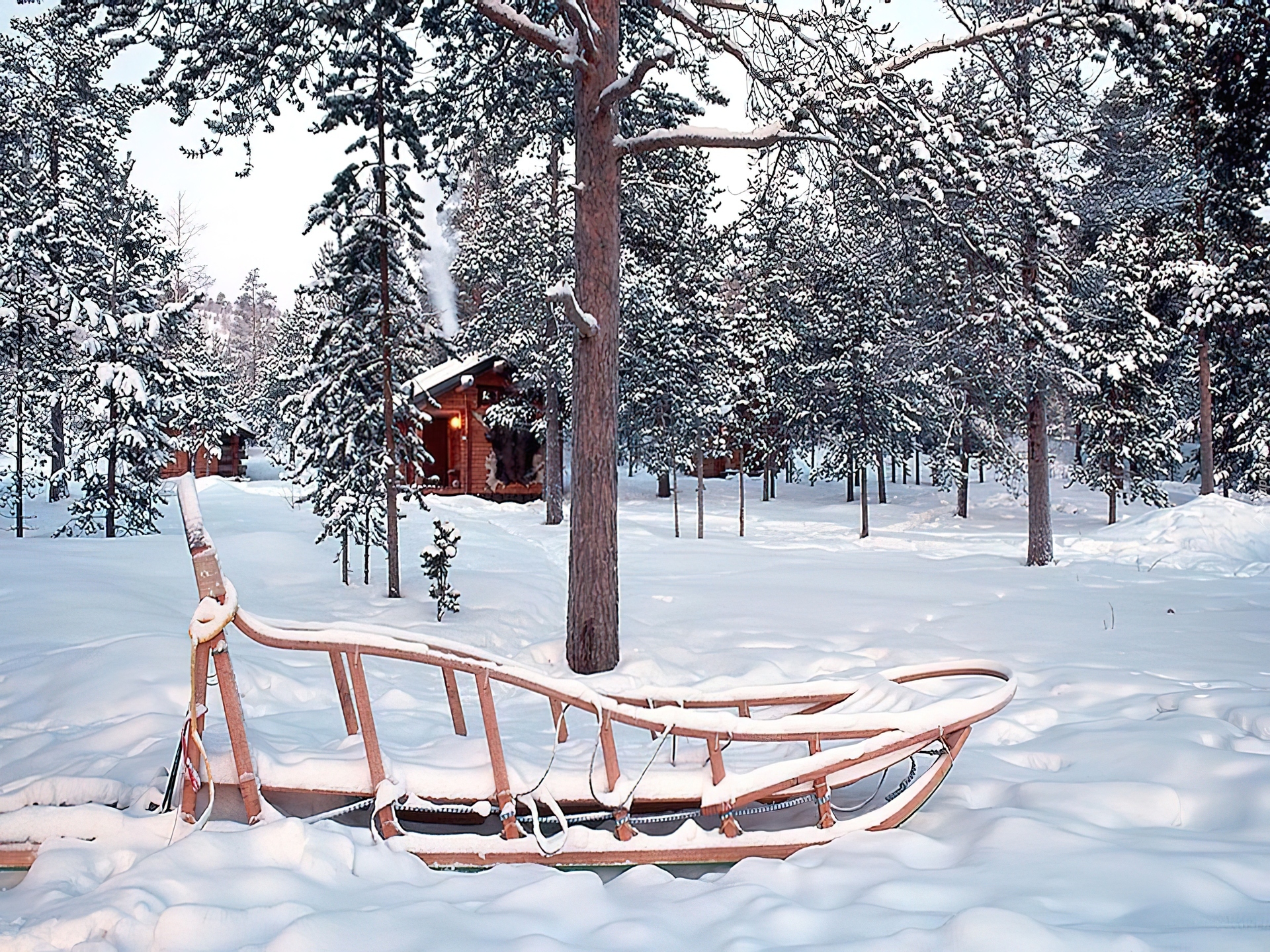 Edytor tapety: Zima, Domek, W, Lesie, Sanki