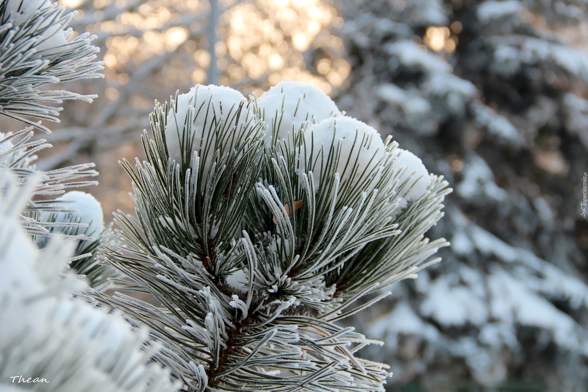 Edytor tapety: Ośnieżona, Sosna, Mróz