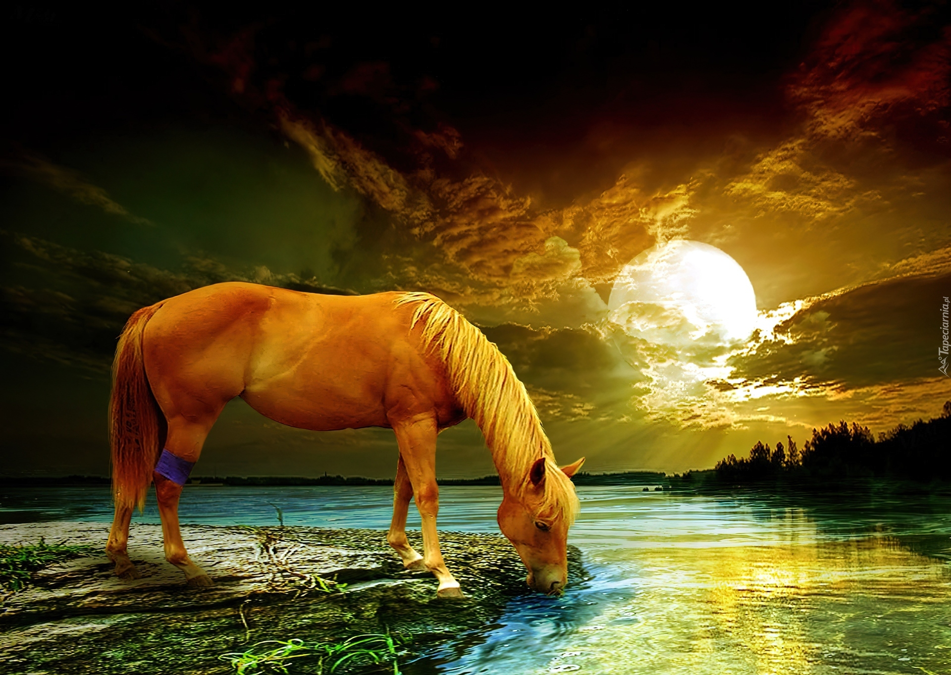 Edytor tapety: Konik, Rzeka, Chmury, Księżyc