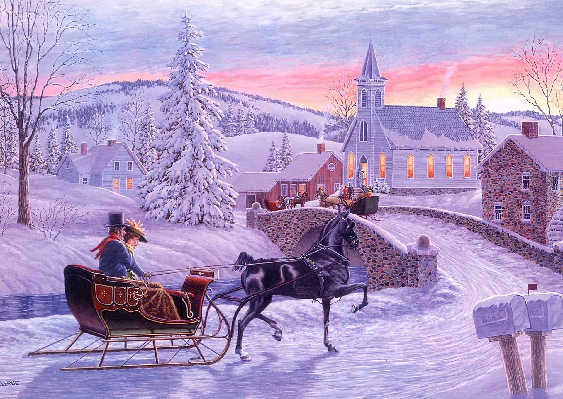 Edytor tapety: Zima, Sanie, Kościół, Malarstwo