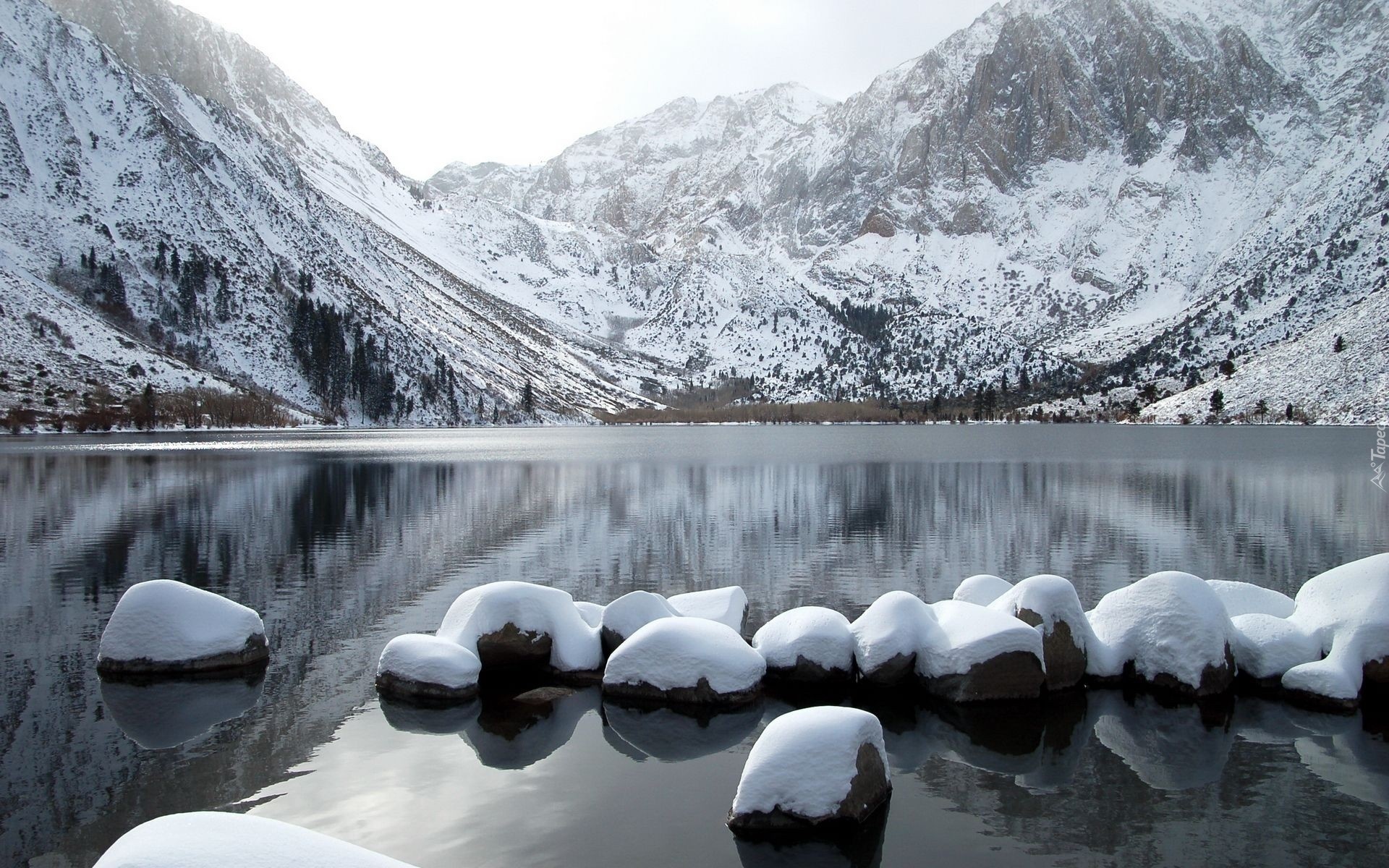 Edytor tapety: Zima, Jezioro, Ośnieżone, Góry, Kamienie