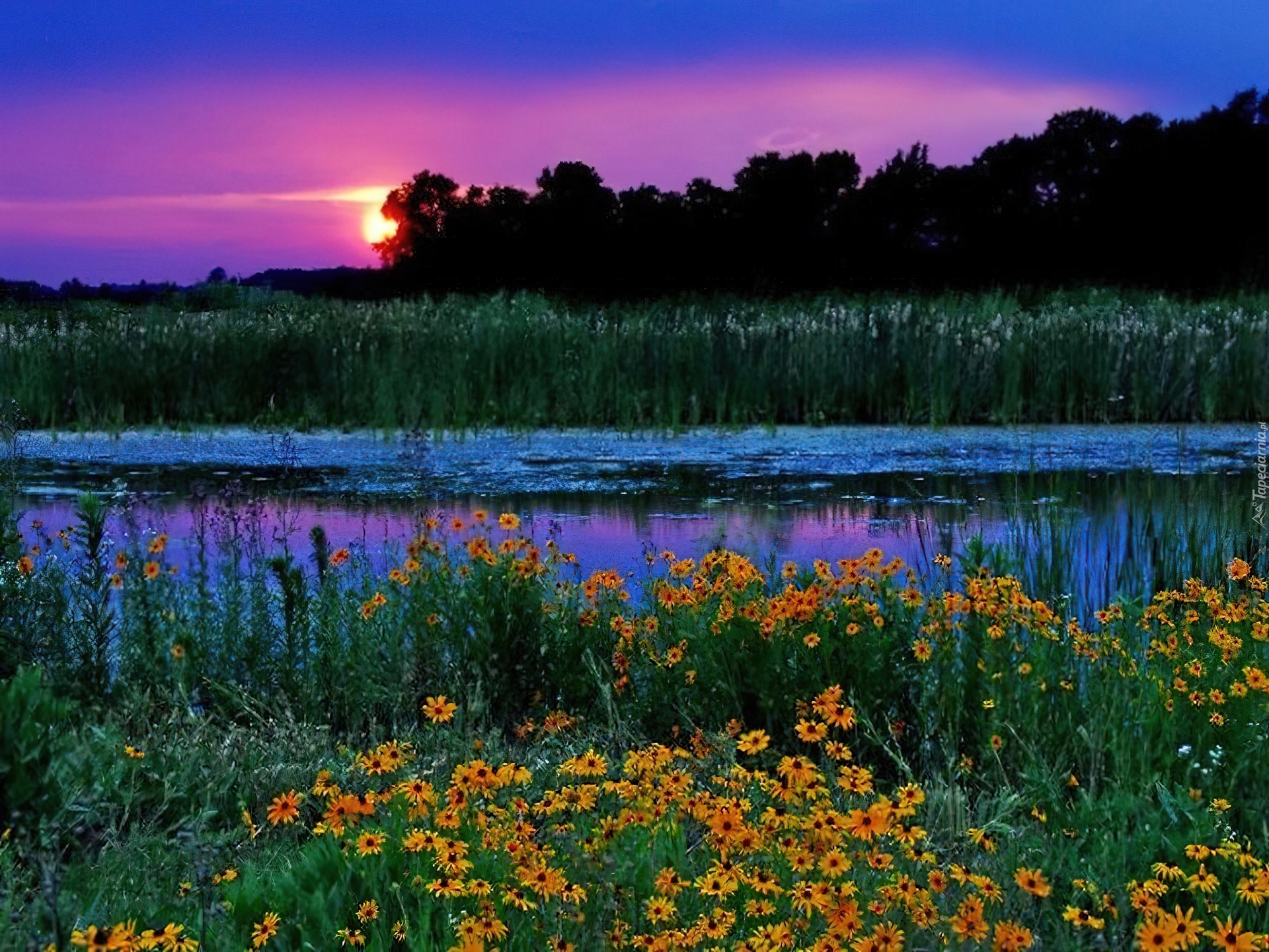 Edytor tapety: Zachód Słońca, Jezioro, Kwiaty
