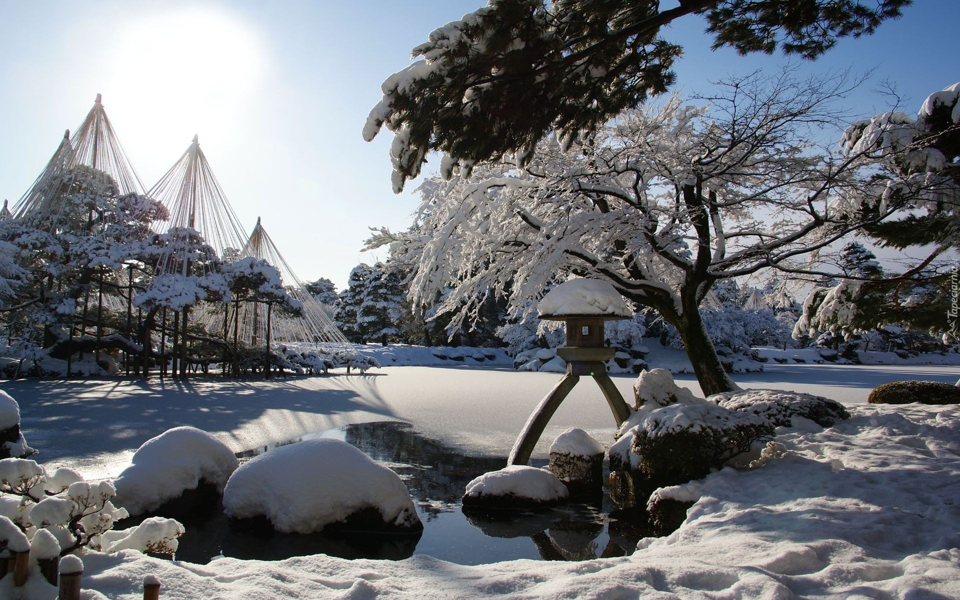 Edytor tapety: Zima, Ośnieżone, Drzewa, Staw