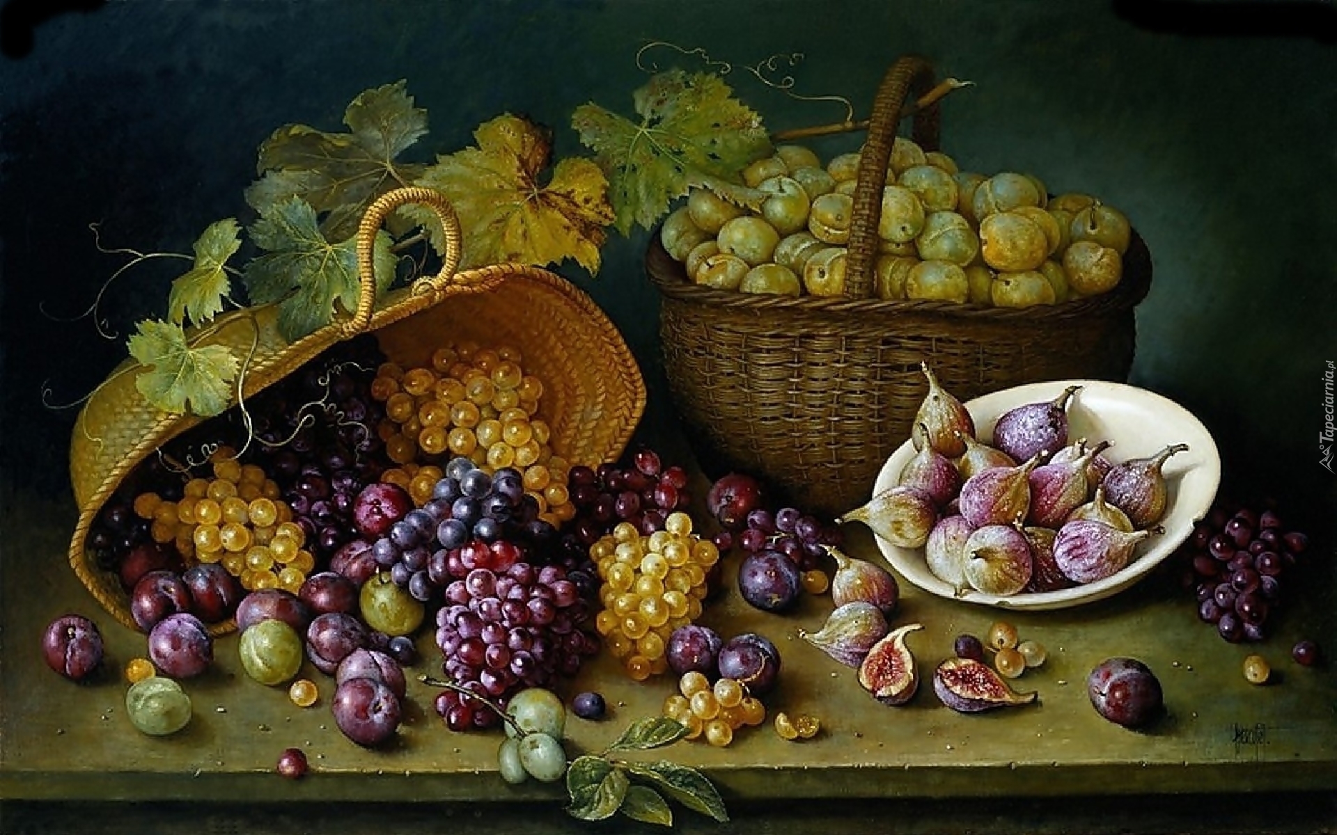 Edytor tapety: Owoce, Winogrona, Kosze, Stół, Śliwki