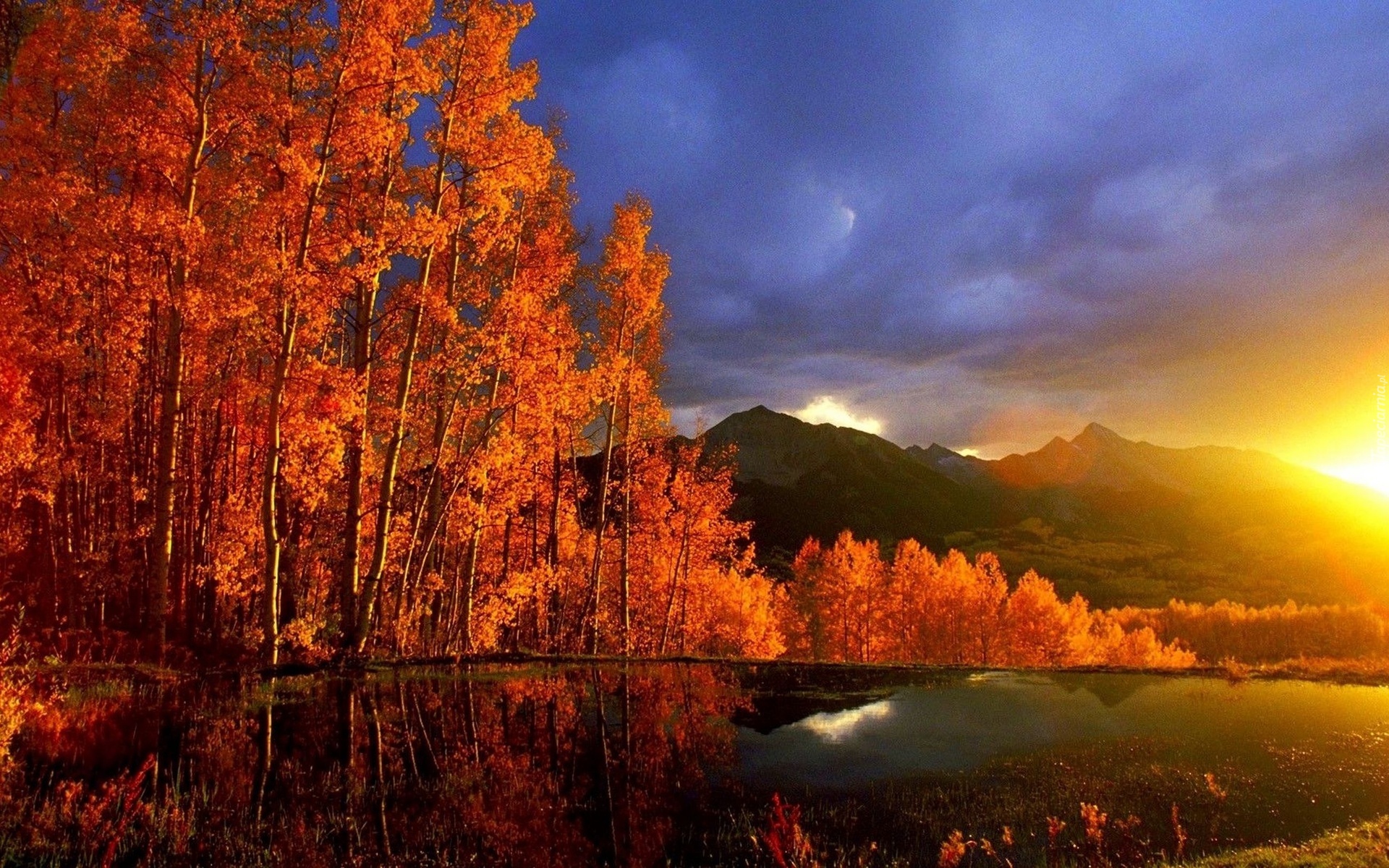 Edytor tapety: Jeziora, Drzewa, Góry, Zachody, Słońca