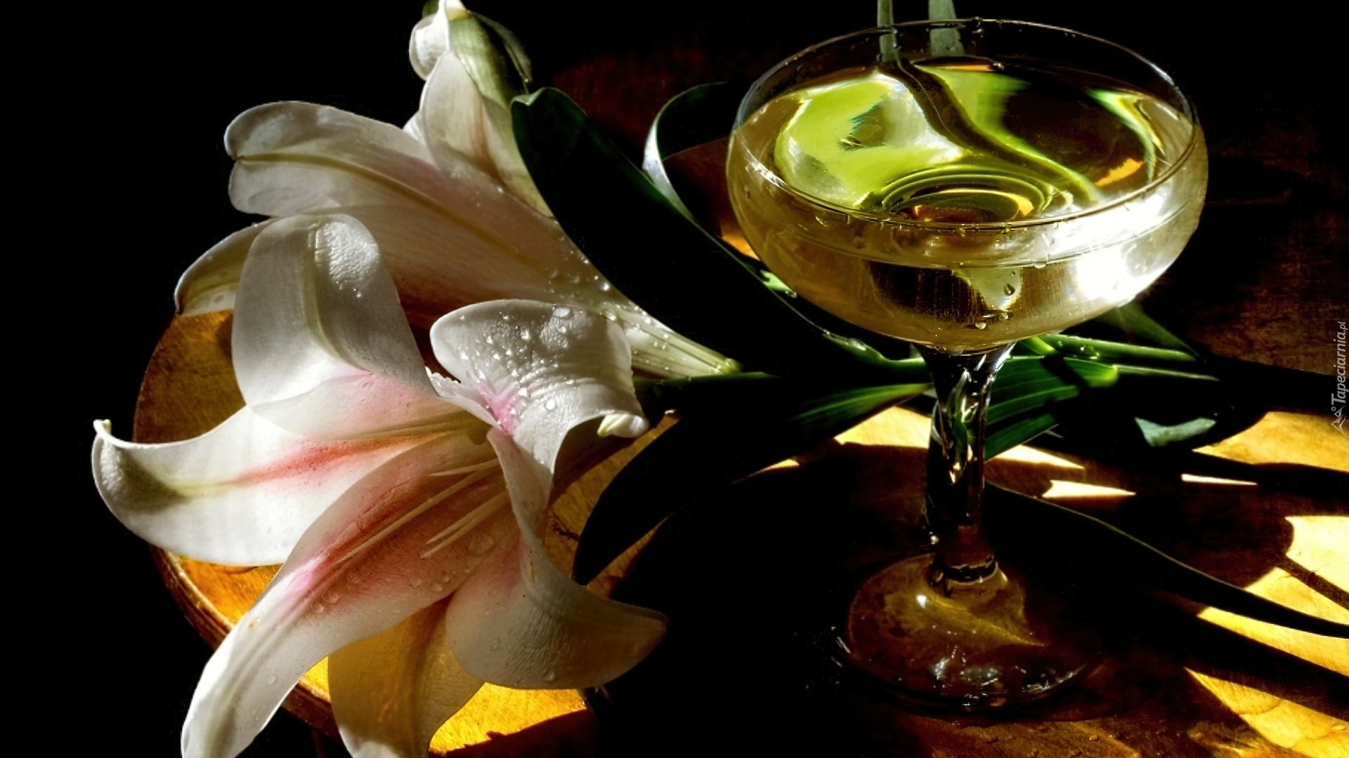 Edytor tapety: Kwiaty, Białe, Lilie, Kieliszek, Szampan