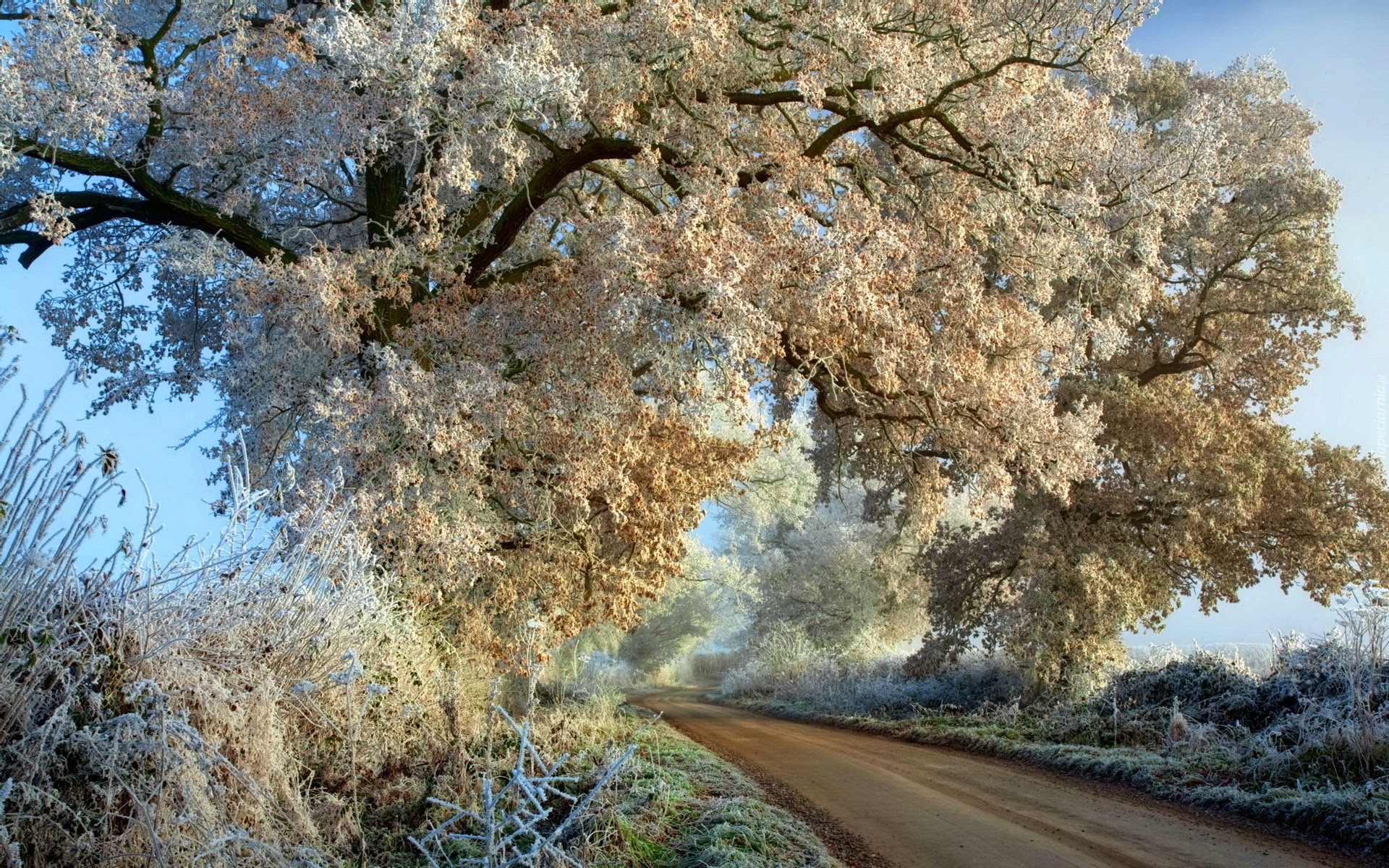 Edytor tapety: Drzewo, Zamarznięte, Liście, Droga, Szron