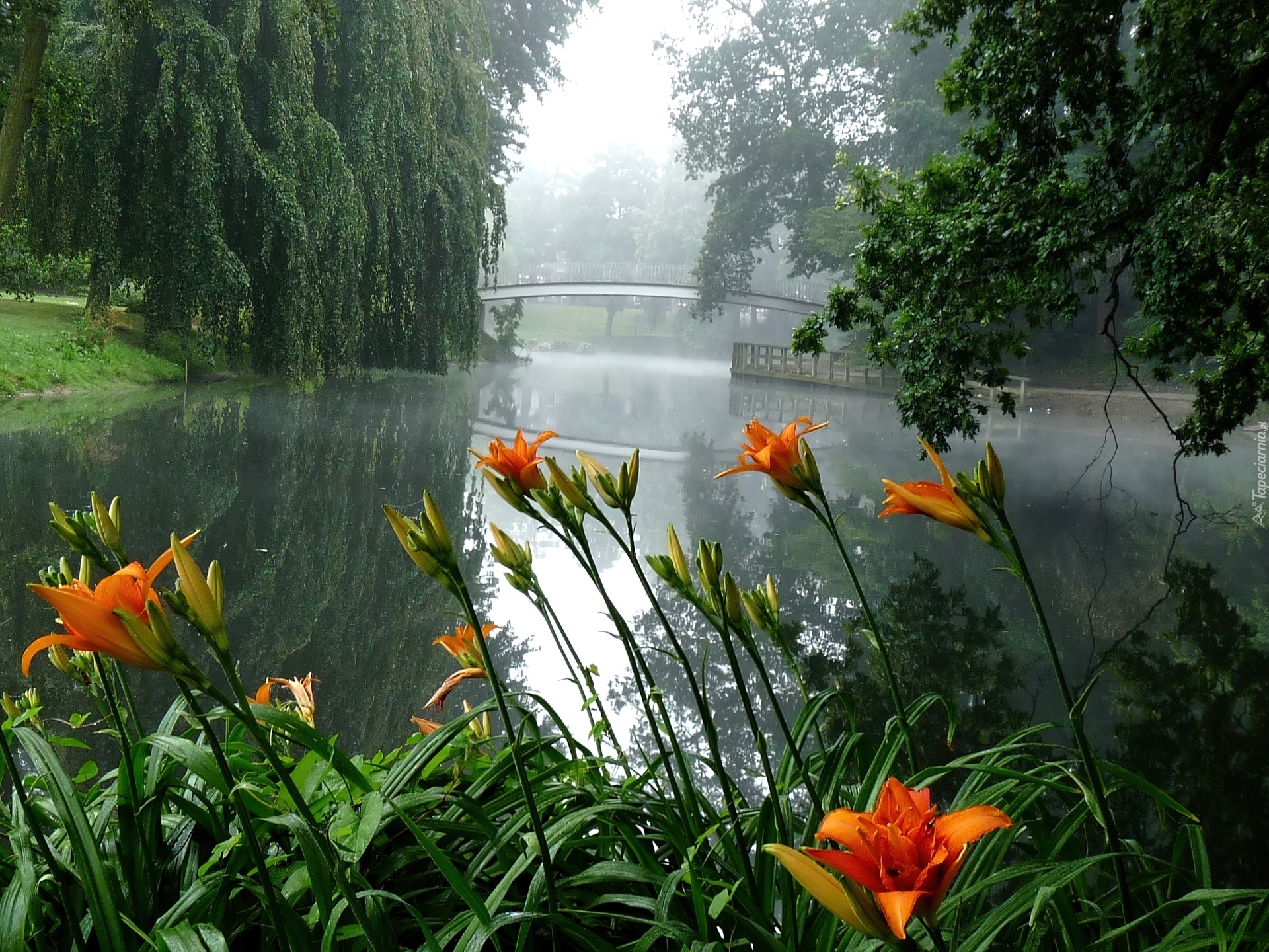 Edytor tapety: Park, Jeziorko, Kwiaty, Drzewa