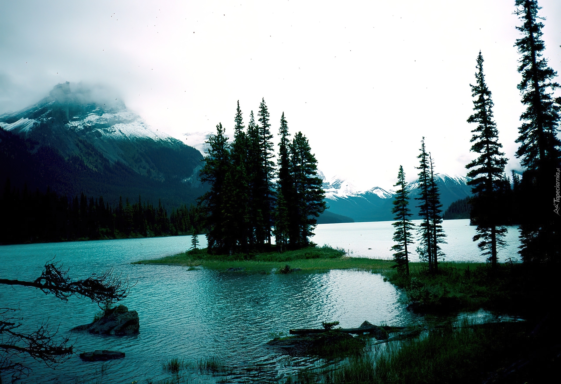 Edytor tapety: Jezioro, Wysepka, Góry, Drzewa, Alberta