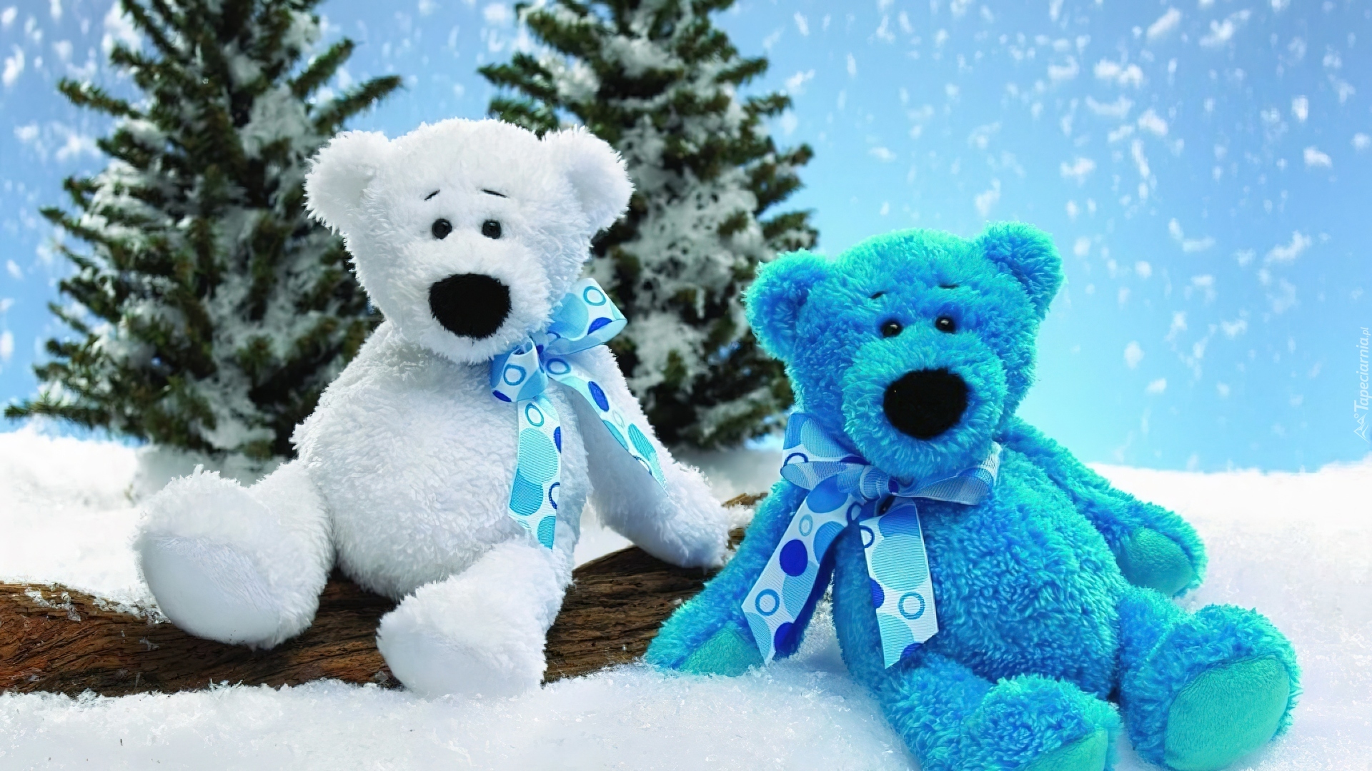 Edytor tapety: Dwa, Misie, Śnieg, Choinki