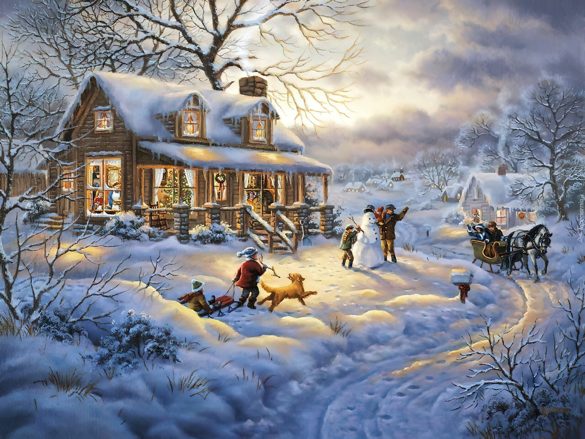 Edytor tapety: Zima, Widoczek, Dom, Dzieci, Zabawa, Malarstwo