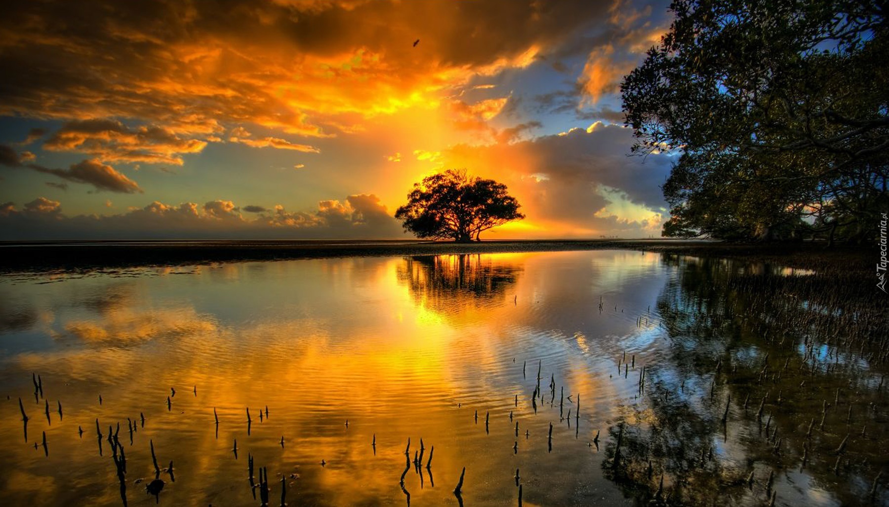 Edytor tapety: Zachód, Słońca, Jezioro, Drzewa
