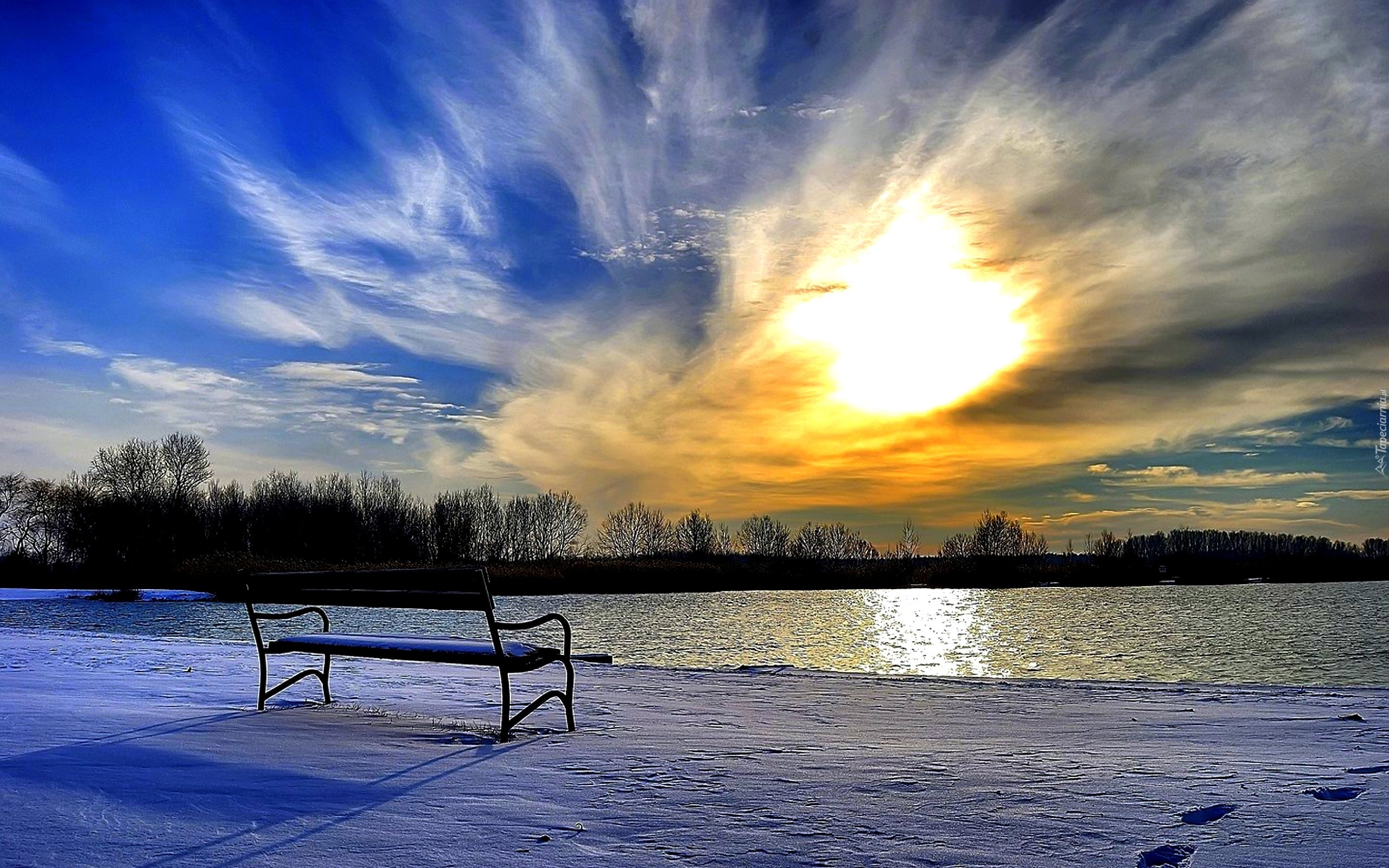 Edytor tapety: Zachód Słońca, Jezioro, Zima, Ławka