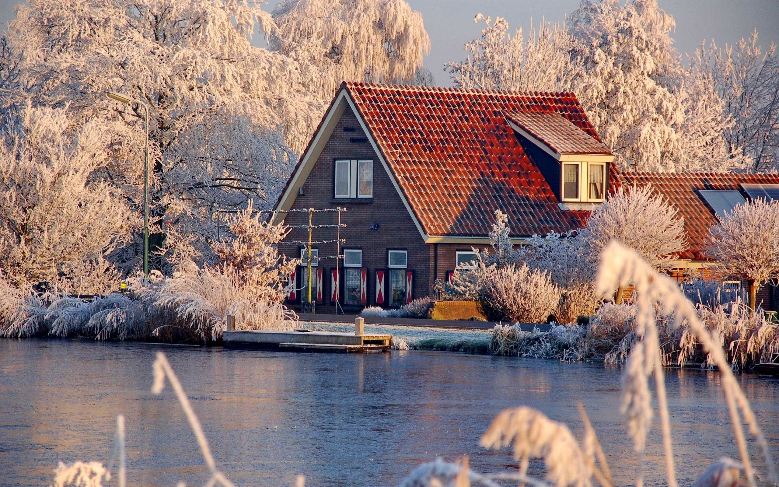 Edytor tapety: Dom, Nad, Jeziorem, Drzewa