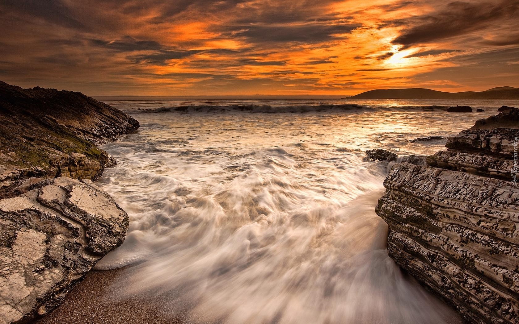 Edytor tapety: Morze, Zachód Słońca, Fale, Skały