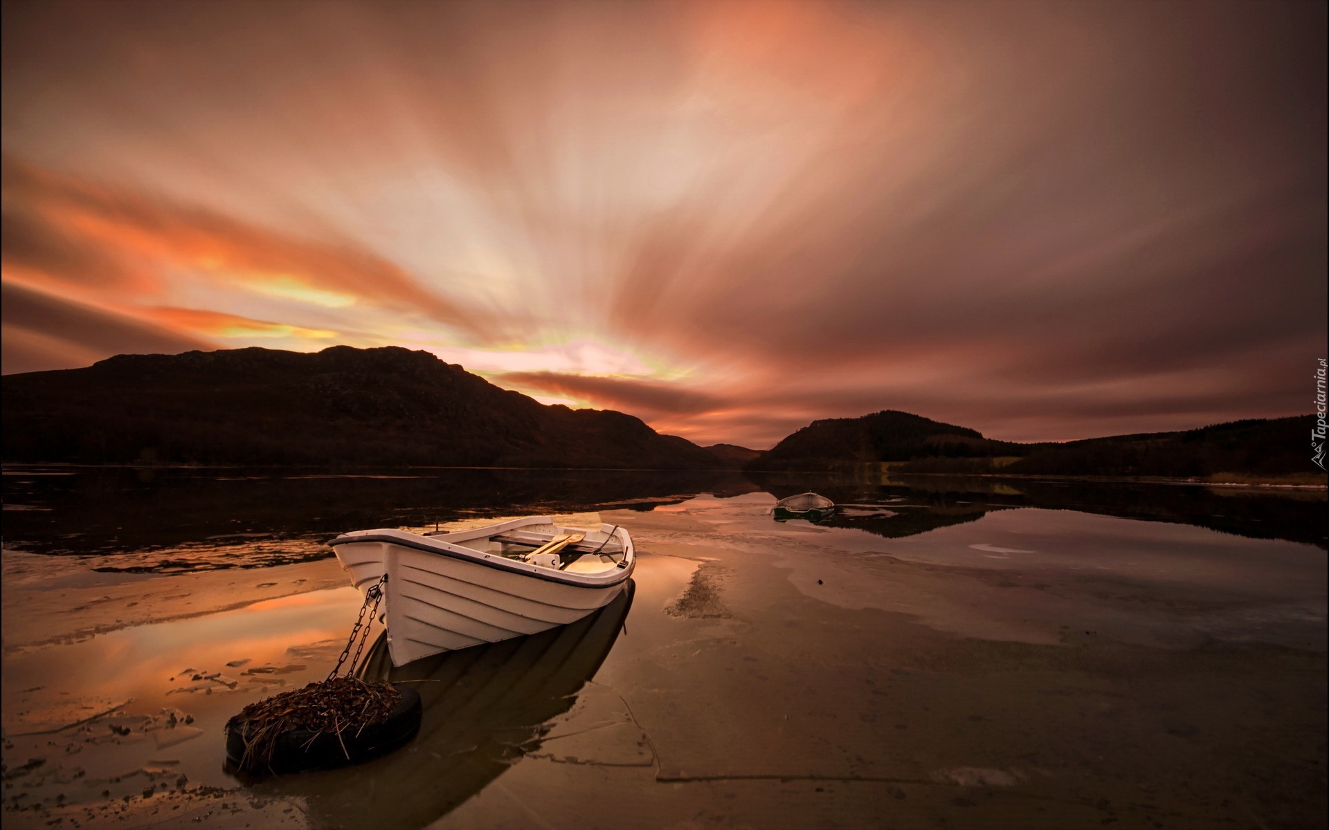 Edytor tapety: Zachód, Słońca, Góry, Jezioro, Łódź