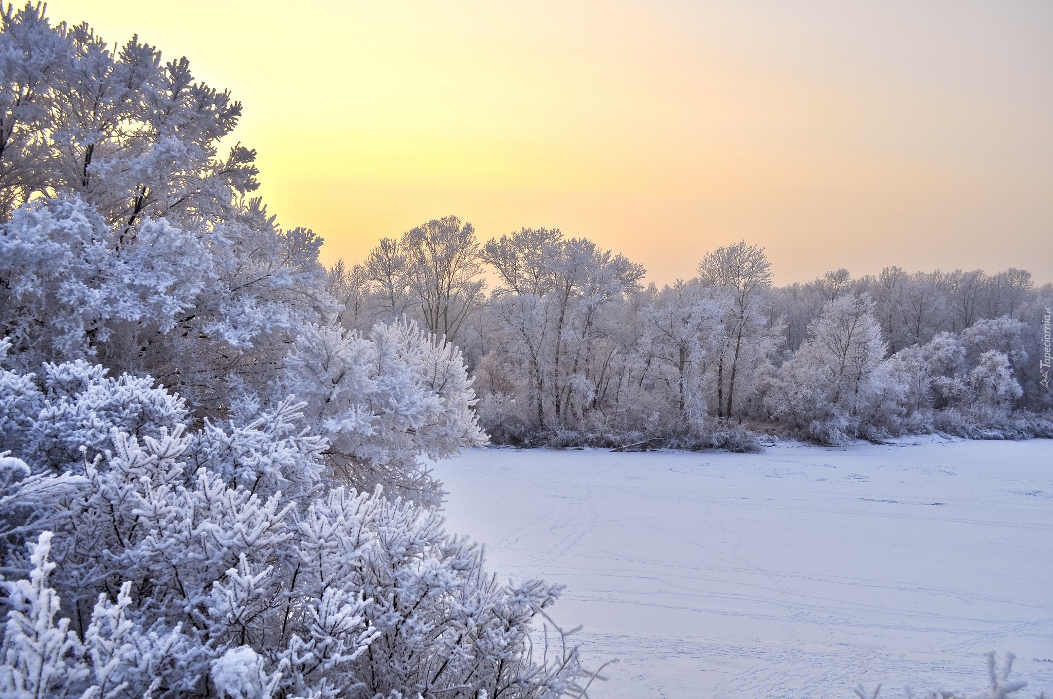Edytor tapety: Zachód, Słońca, Drzewa, Śnieg, Zima
