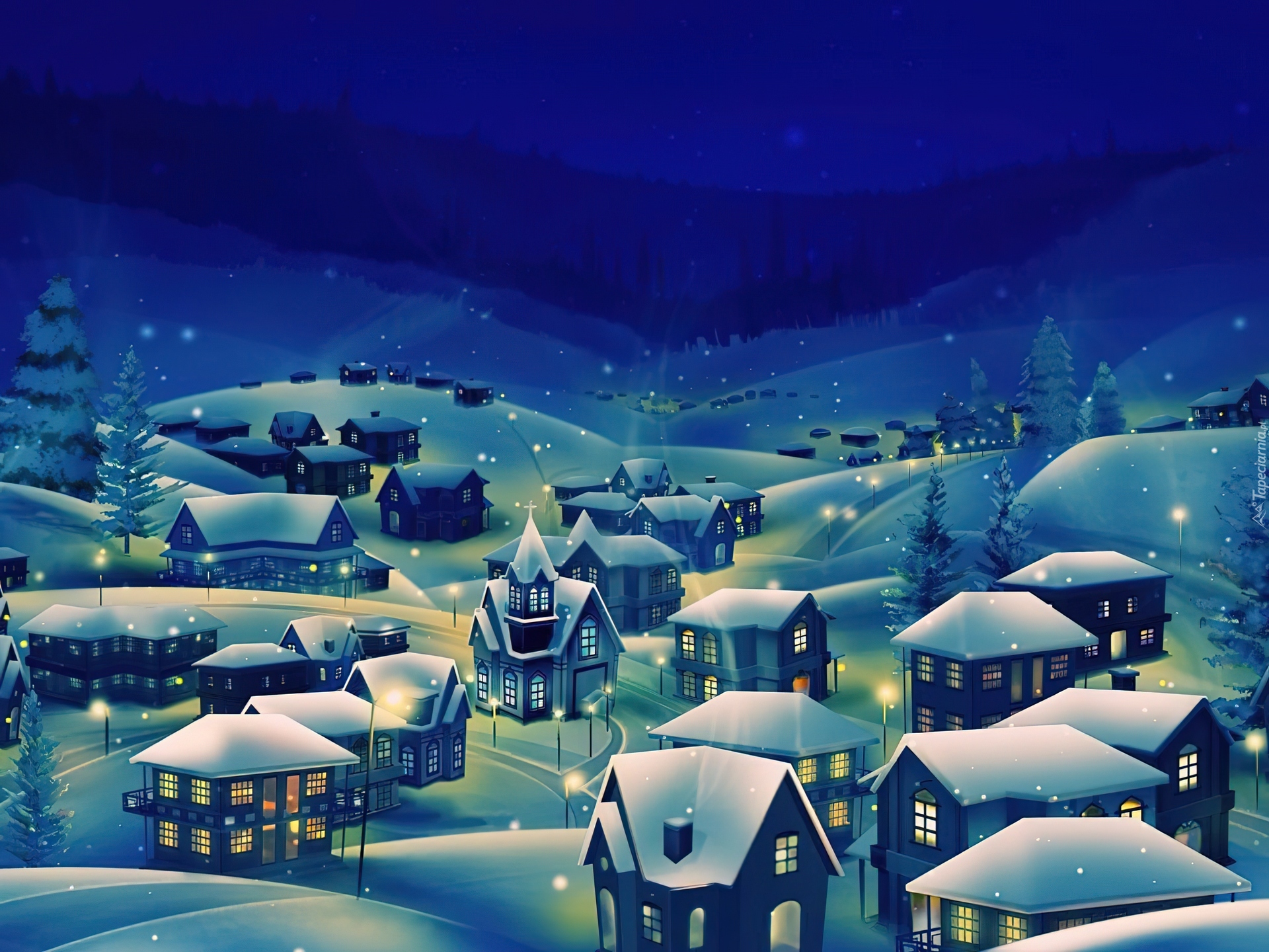Edytor tapety: Miasto, Noc, Zima, Malarstwo