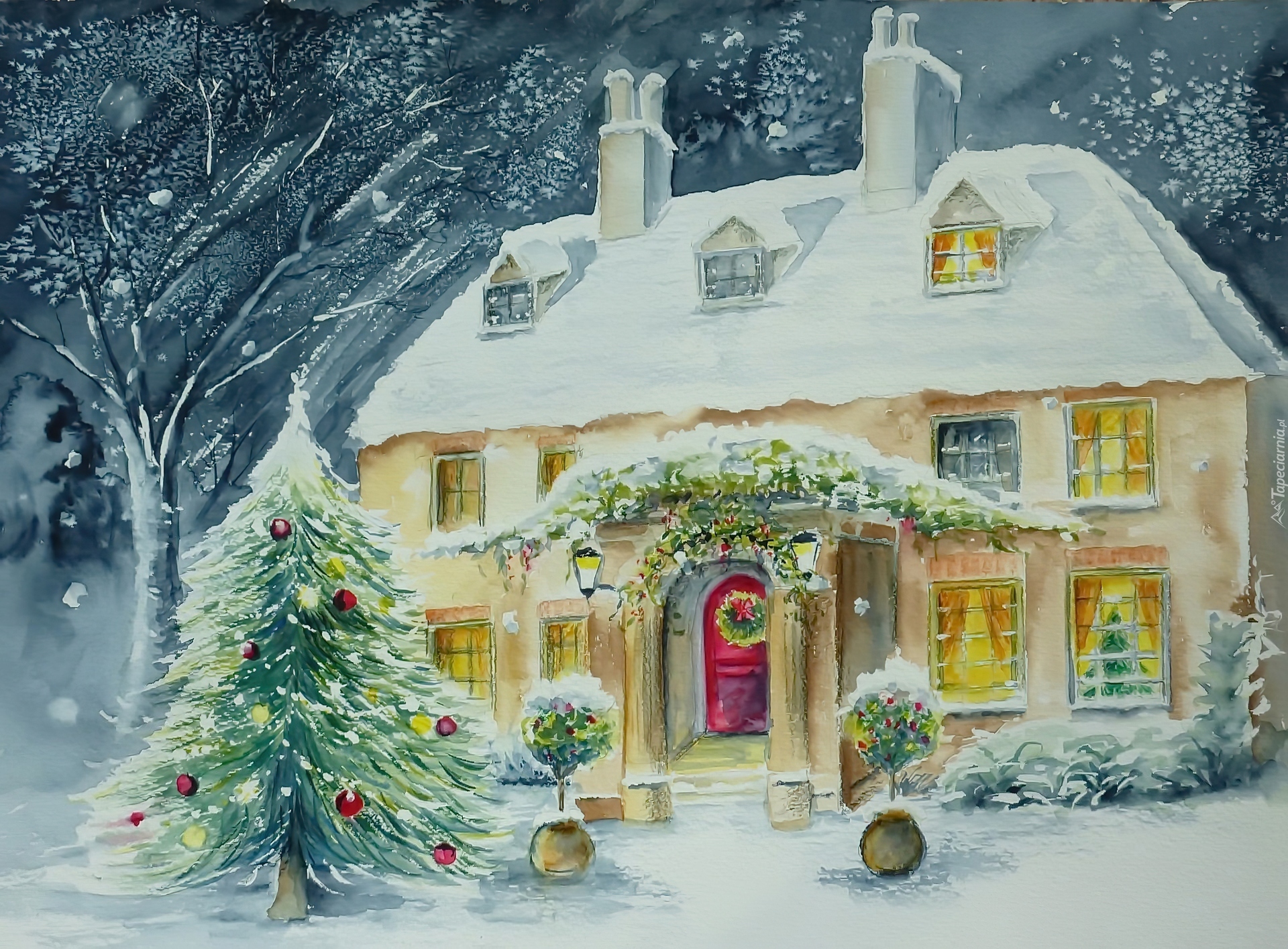 Edytor tapety: Dom, Choinka, Zima, Boże, Narodzenie, Malarstwo