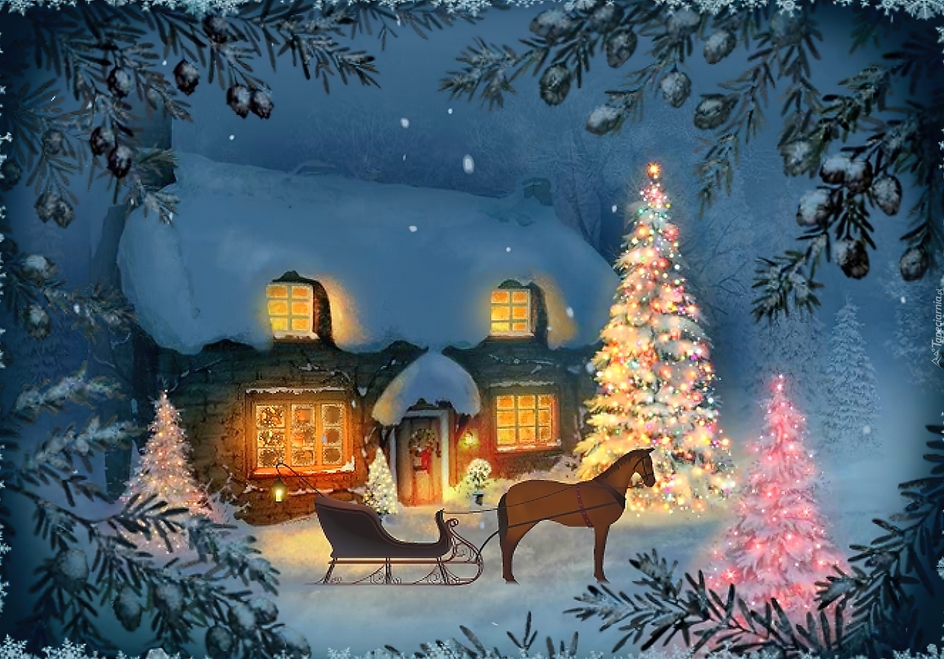 Edytor tapety: Dom, Choinka, Sanie, Boże, Narodzenie, Malarstwo