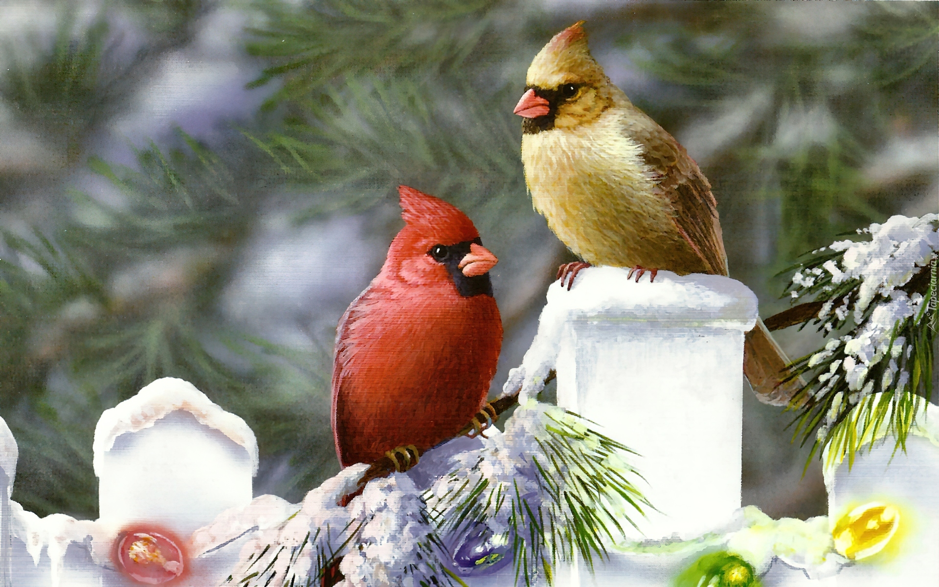 Edytor tapety: Ptaki, Kardynały, Zima, Malarstwo