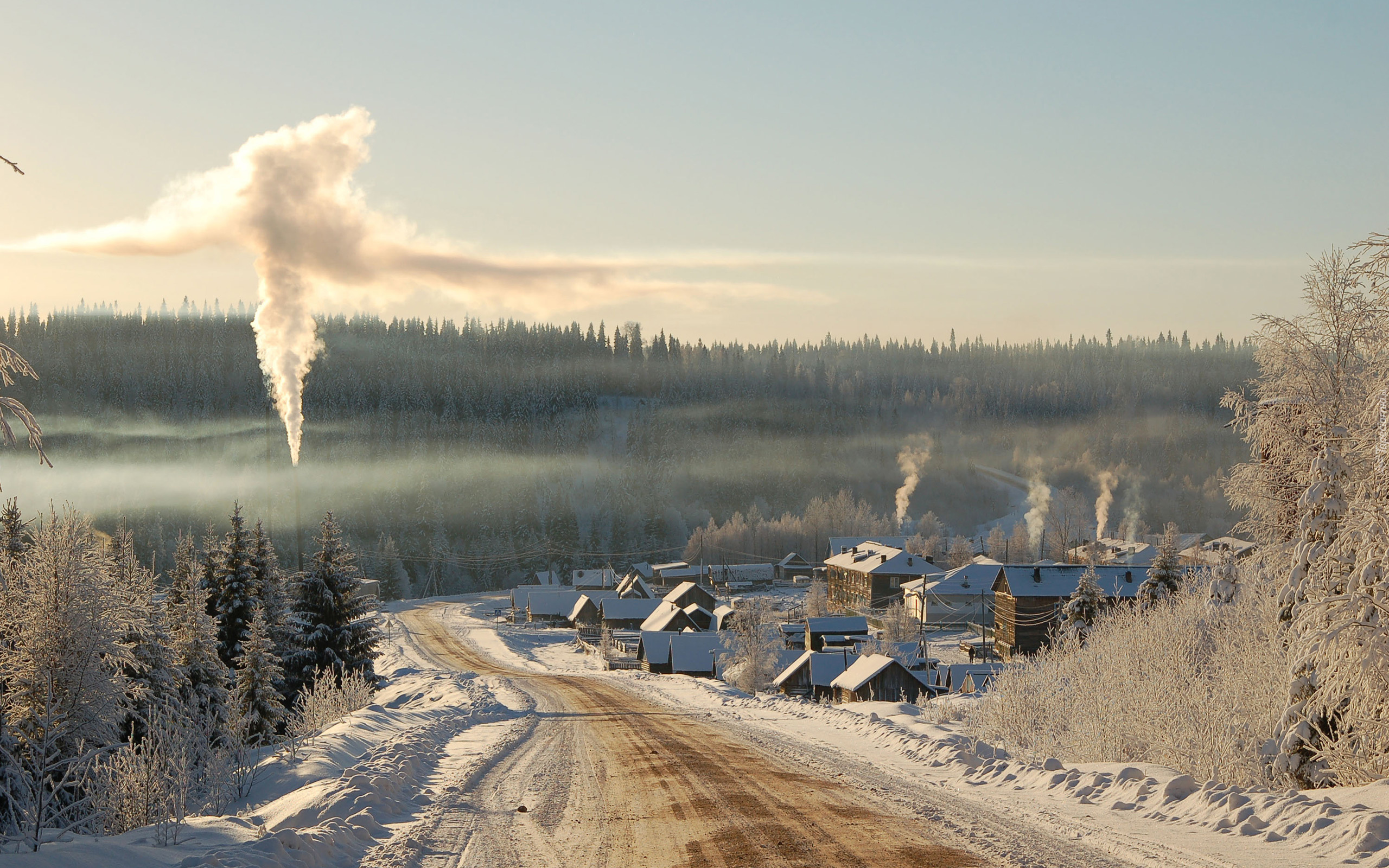 Edytor tapety: Zima, Droga, Domy, Las