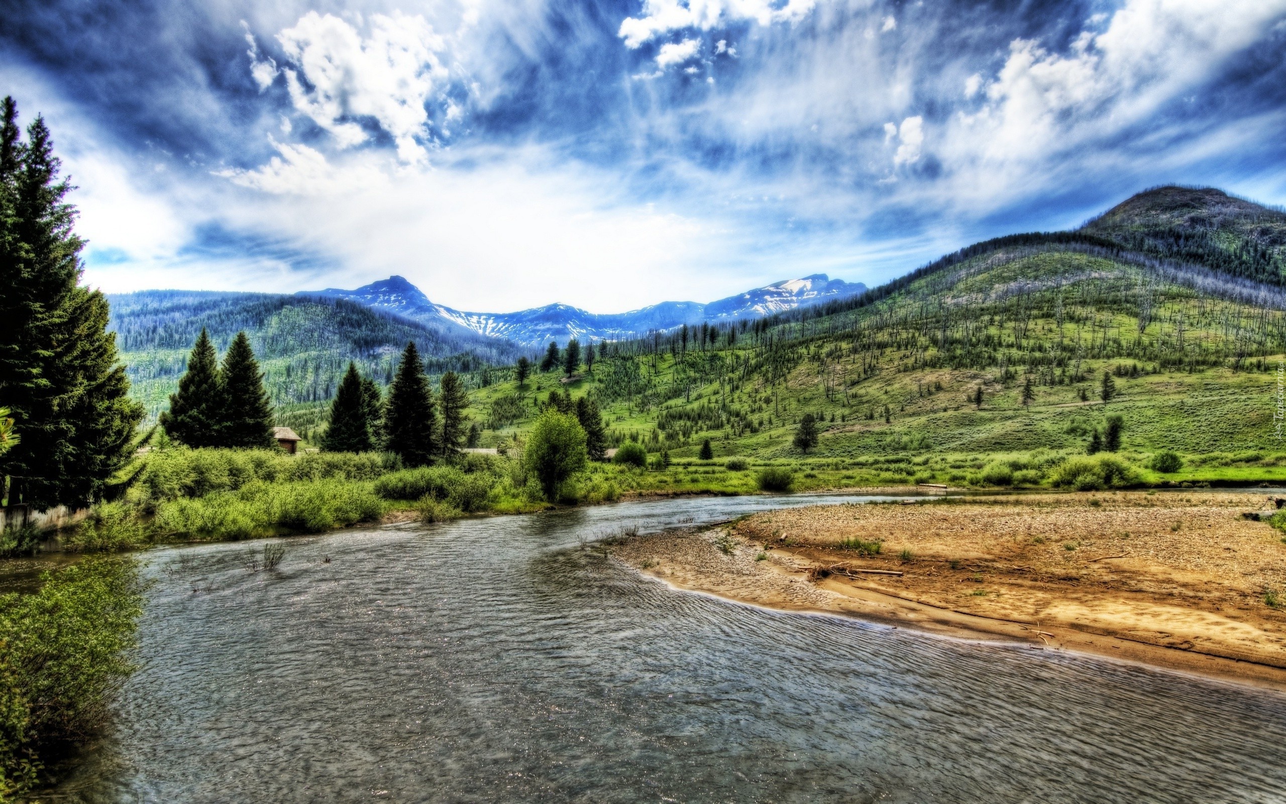 Edytor tapety: Rzeka, Góry, Drzewa, Chmury