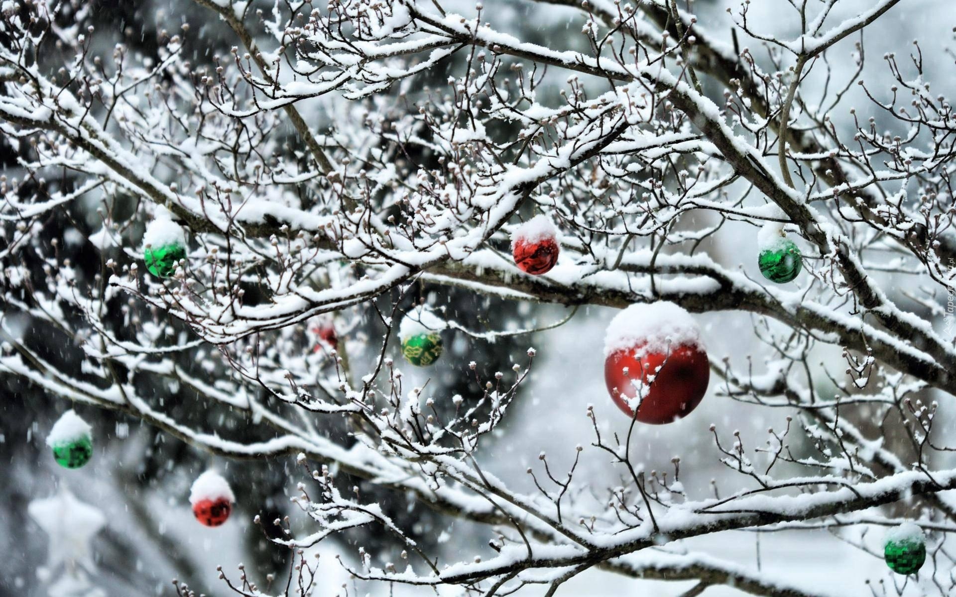 Edytor tapety: Ośnieżone, Drzewo, Bombki, Świąteczne, Zima