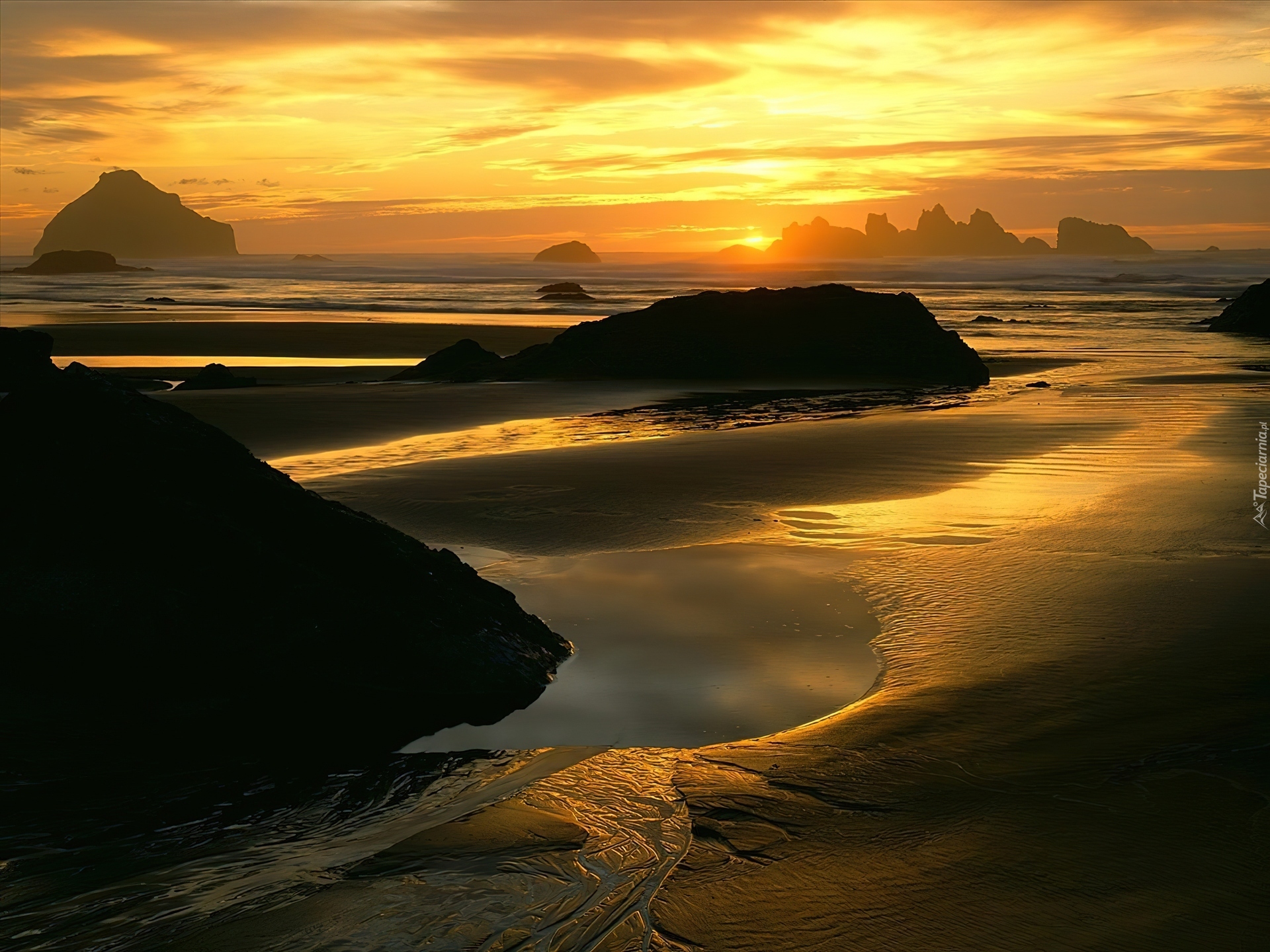 Edytor tapety: Zachód, Słońca, Plaża, Skałki, Kamienie