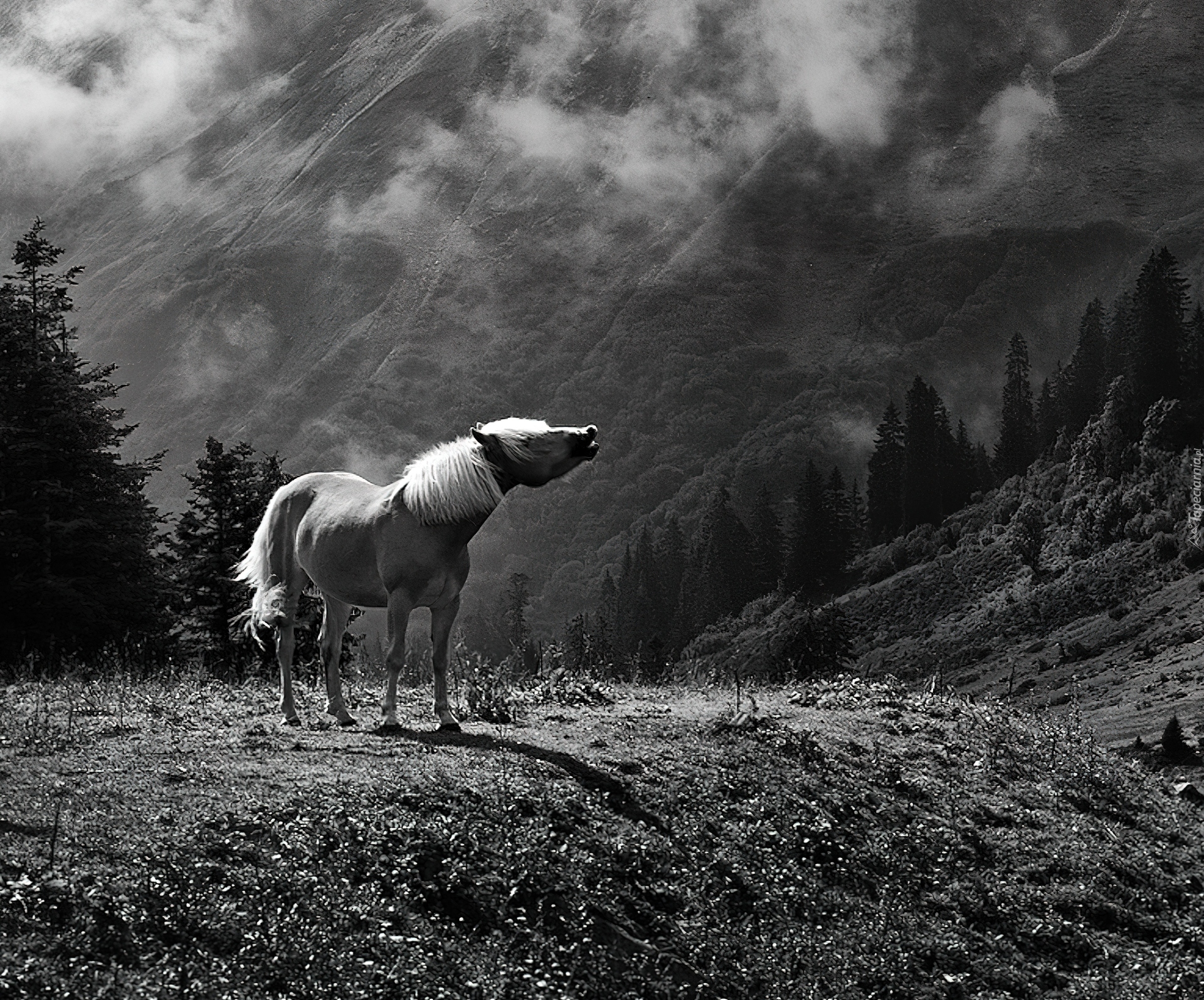 Edytor tapety: Konik, Chmury, Góry