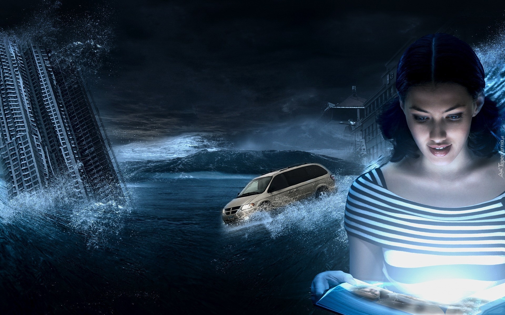 Edytor tapety: Zalany, Świat, Kobieta, Drapacze, Chmur, Samochód