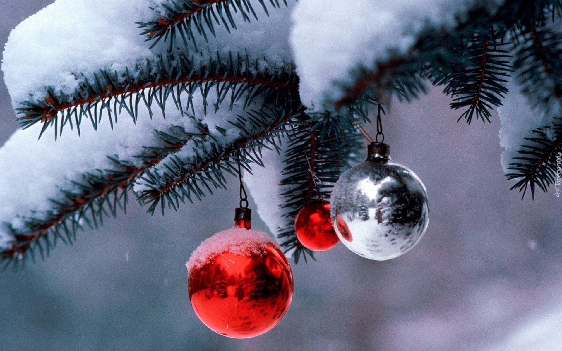Edytor tapety: Ośnieżona, Gałąz, Bombki, Świąteczne
