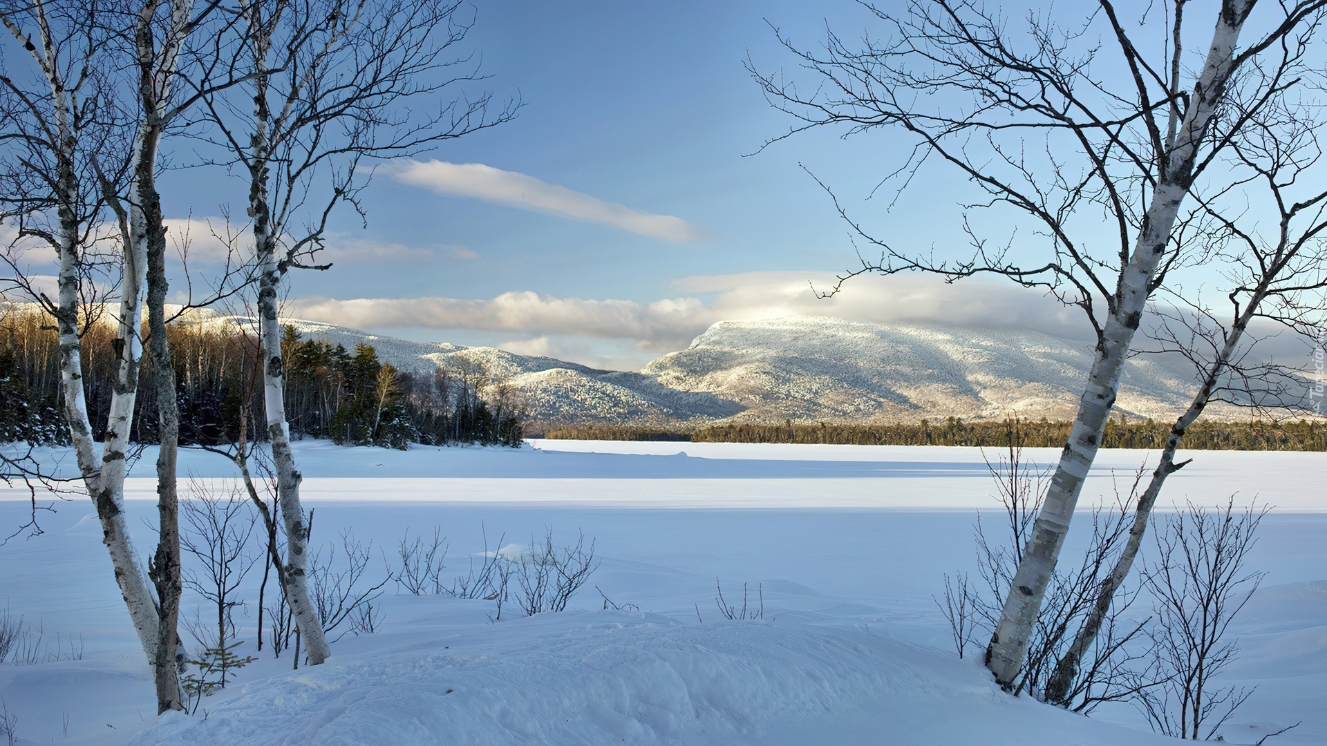 Edytor tapety: Osnieżone, Pole, Drzewa, Góry