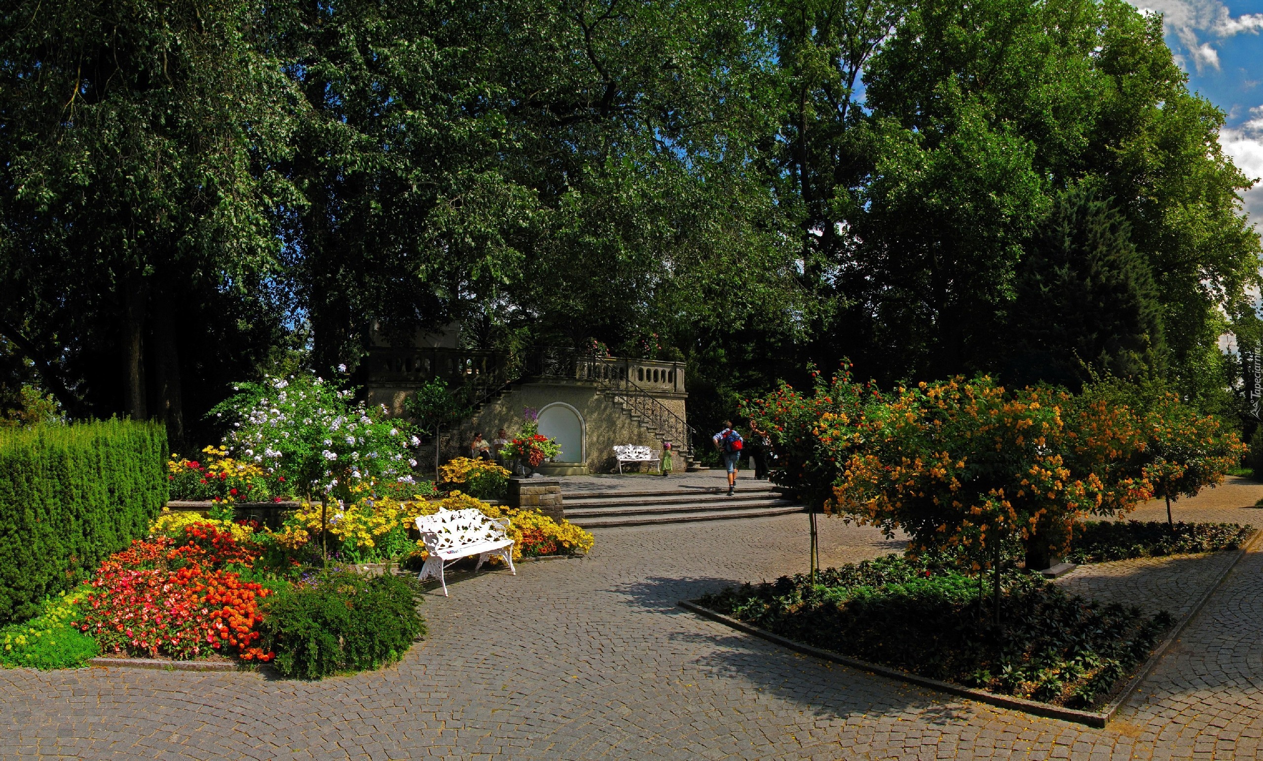 Edytor tapety: Park, Drzewa, Kwiaty, Ławka
