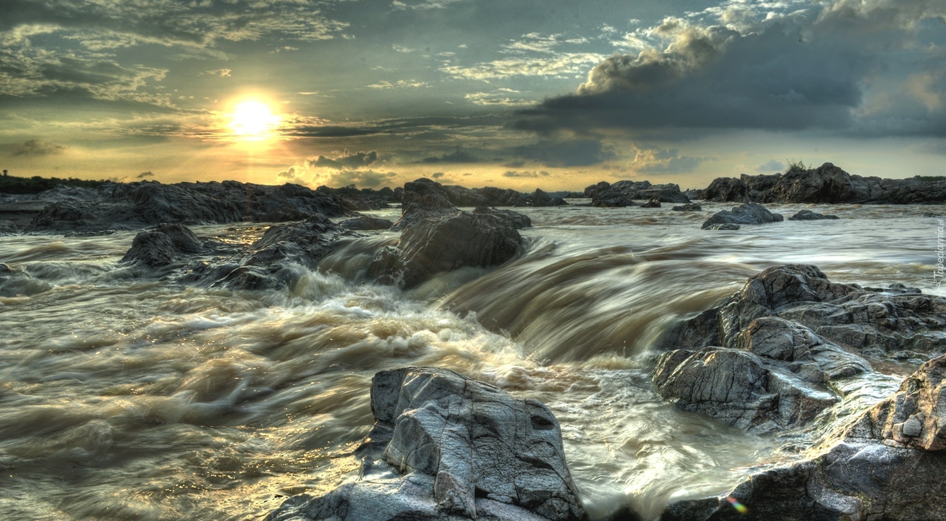 Edytor tapety: Rzeka, Skały, Chmury, Słońce