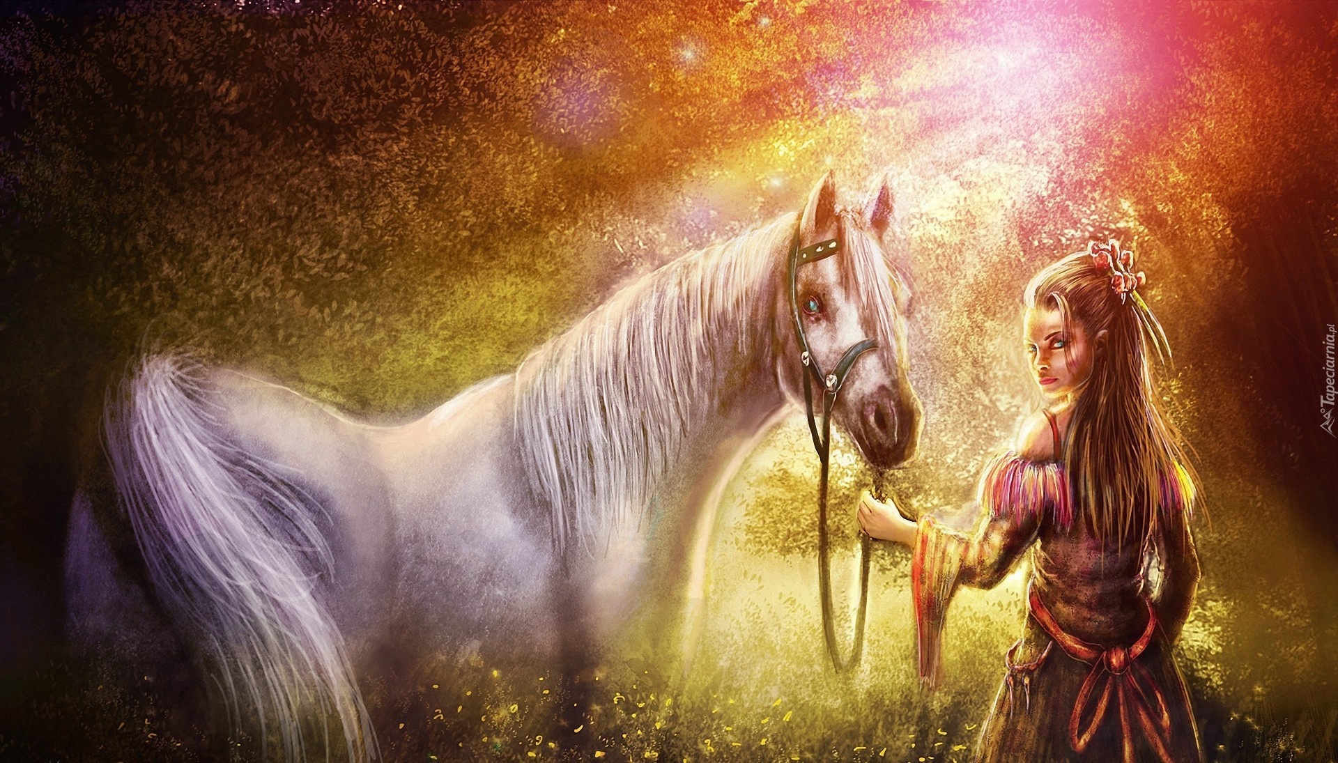 Edytor tapety: Kobieta, Koń, Promienie, Słońca, Łąka