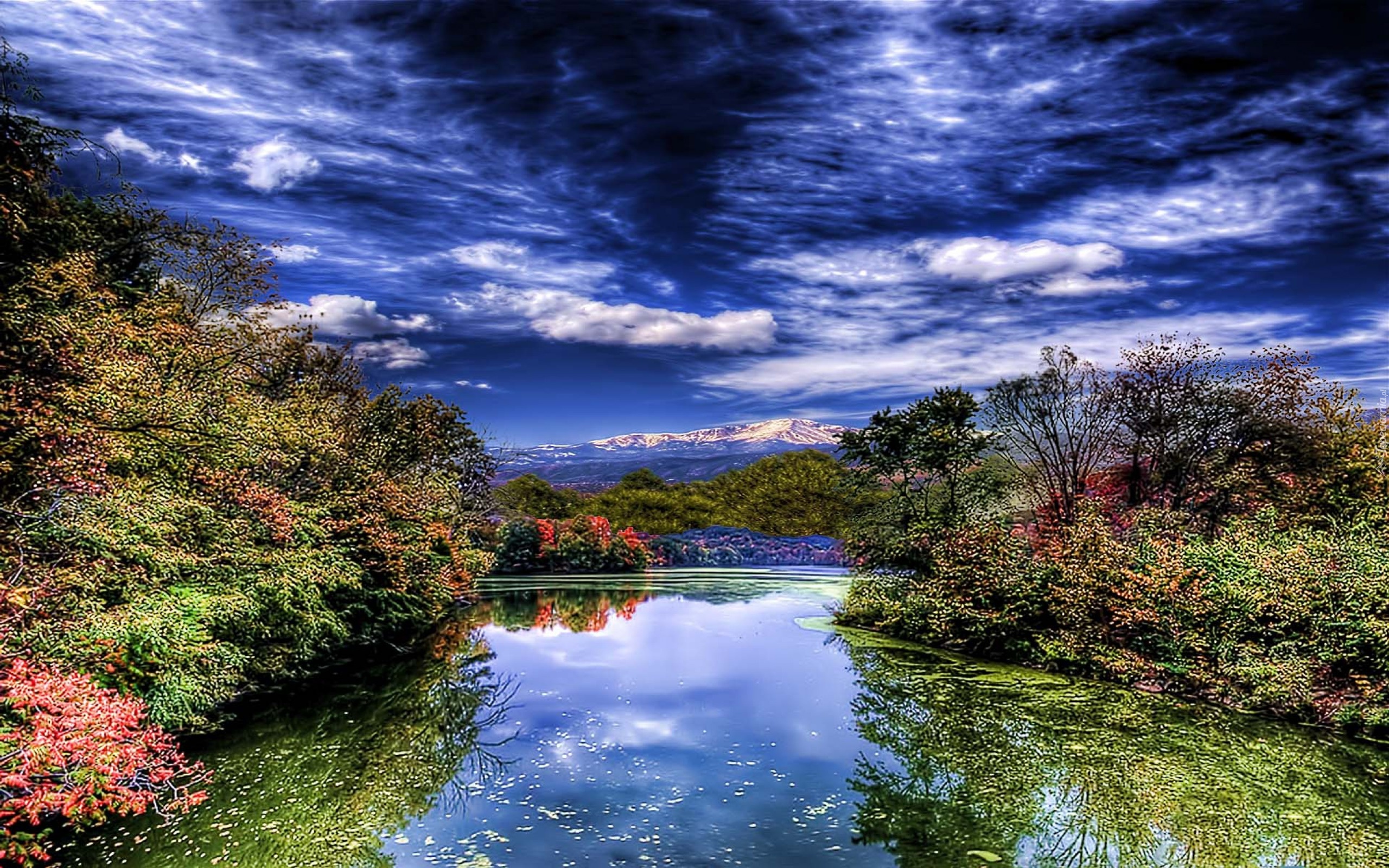 Edytor tapety: Jeziora, Kolorowe, Krzewy, Chmury