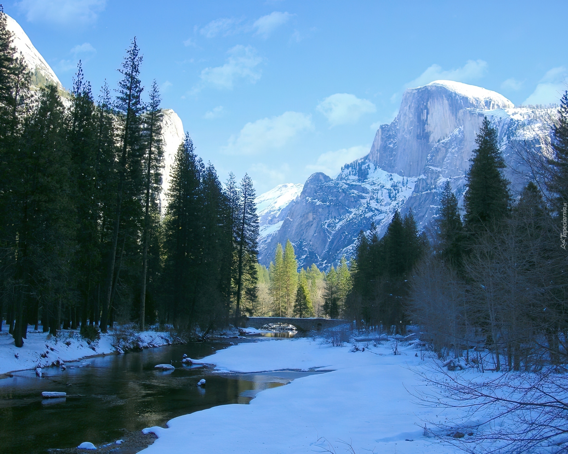 Edytor tapety: Stany Zjednoczone, Stan Kalifornia, Park Narodowy Yosemite, Rzeka, Zalesione, Brzegi, Góry, Zima