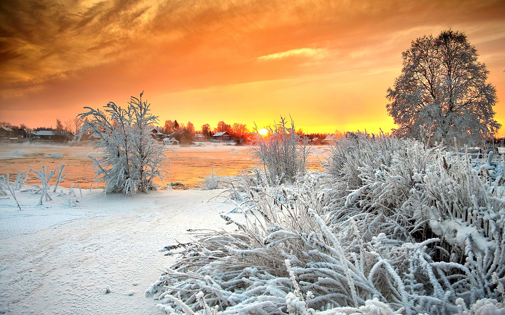 Edytor tapety: Zachód, Słońca, Rzeka, Drzewo, Zima