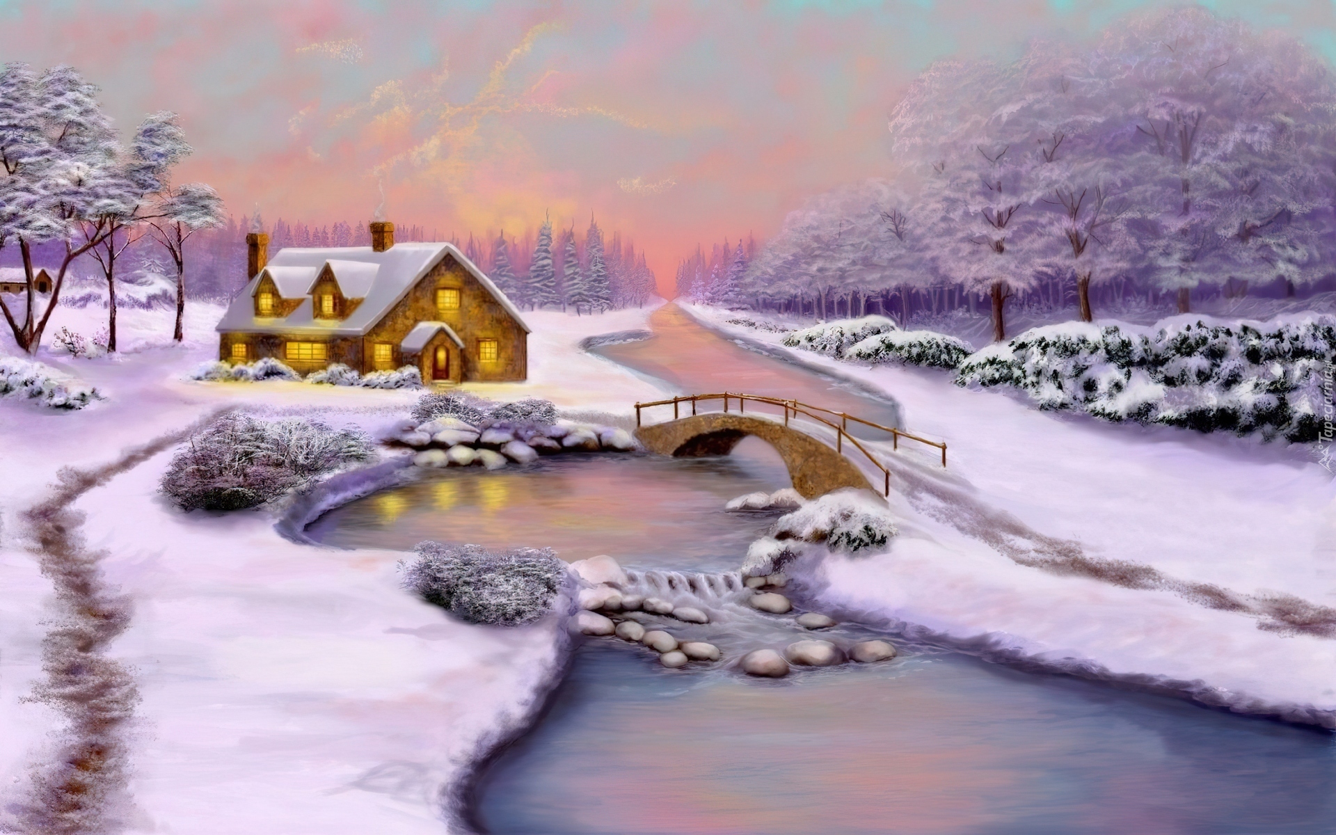 Edytor tapety: Dom, Rzeczka, Mostek, Zima