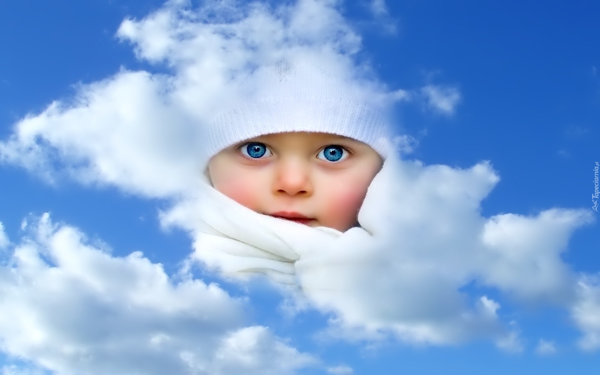 Edytor tapety: Dziecko, Twarz, Niebieskie, Oczy, Niebo, Chmury