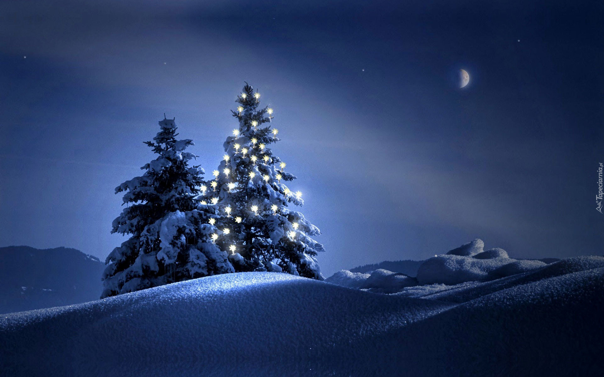 Edytor tapety: Góry, Noc, Oświetlona, Choinka, Zima
