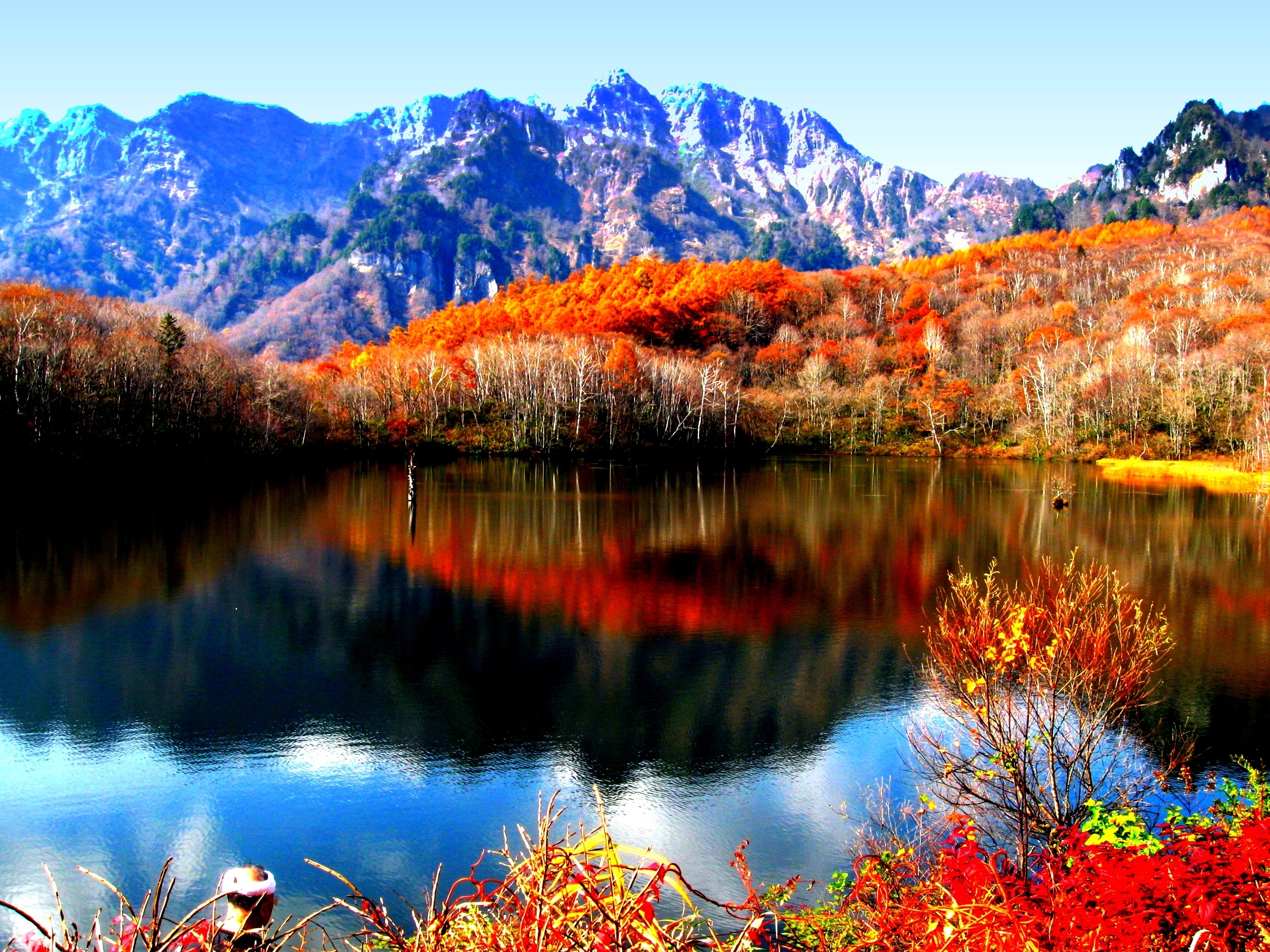 Edytor tapety: Góry, Kolorowe, Drzewa, Jezioro, Jesień
