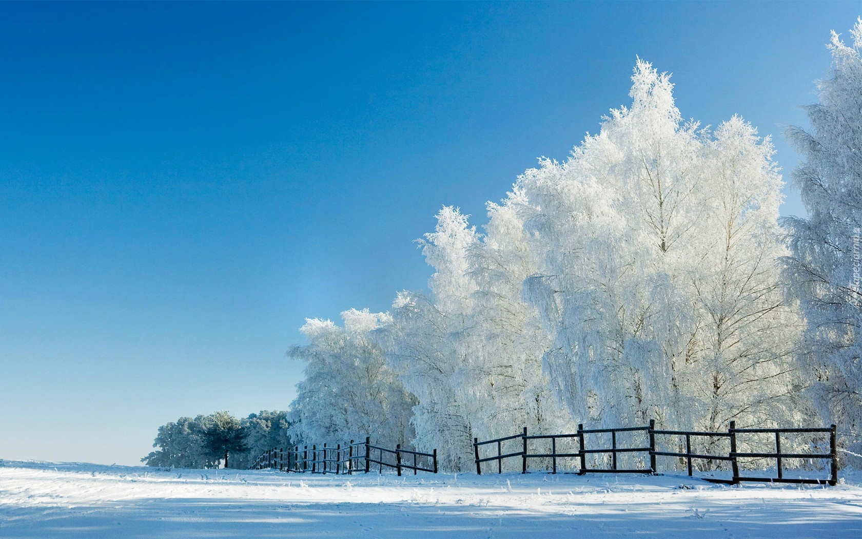 Edytor tapety: Ośnieżone, Pole, Drzewa, Płot