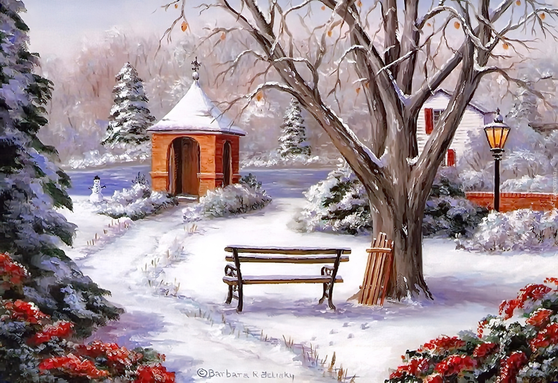 Edytor tapety: Kapliczka, Drzewo, Ławka, Zima