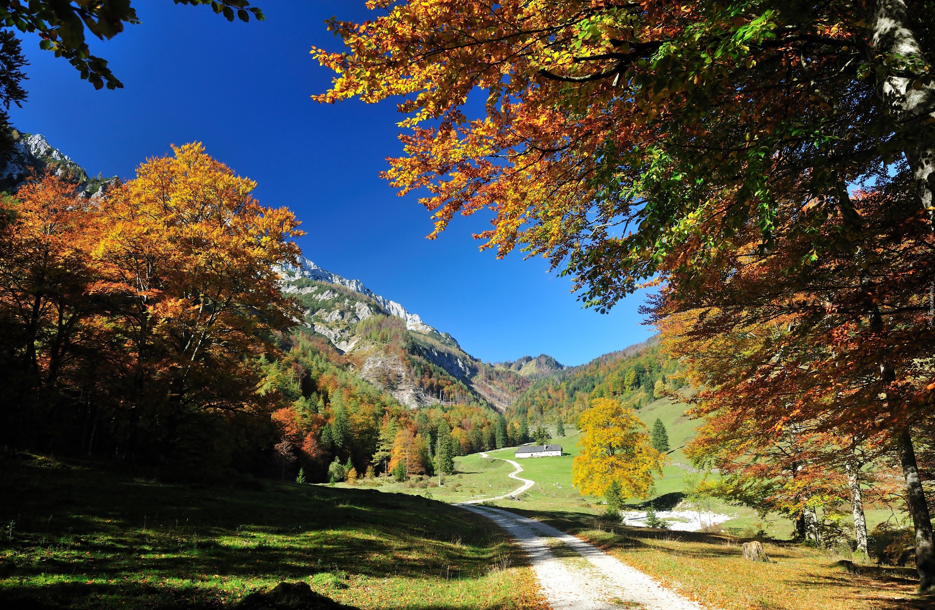 Edytor tapety: Góry, Droga, Drzewa, Jesień
