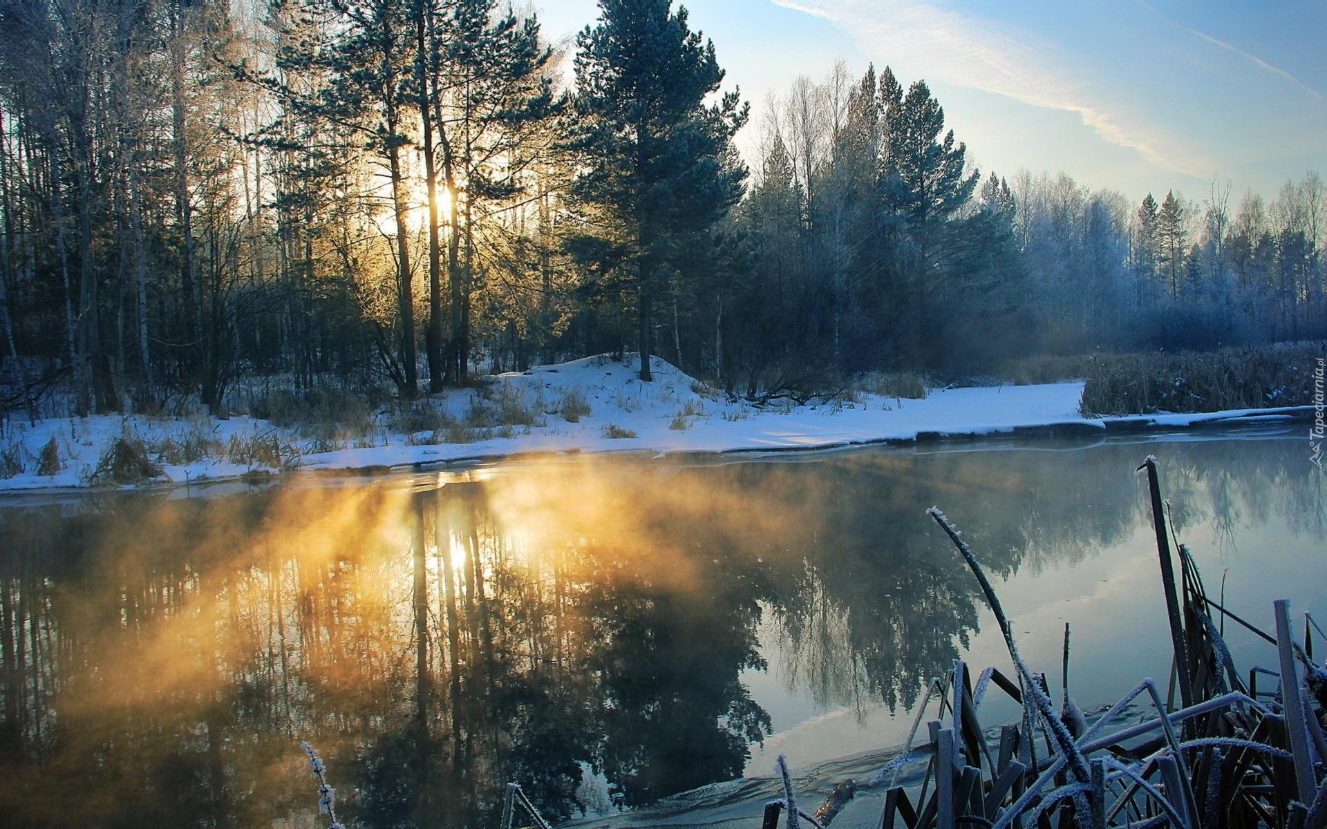 Edytor tapety: Rzeka, Las, Przebijające, Światło, Zima